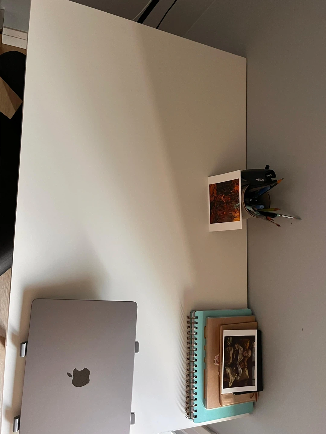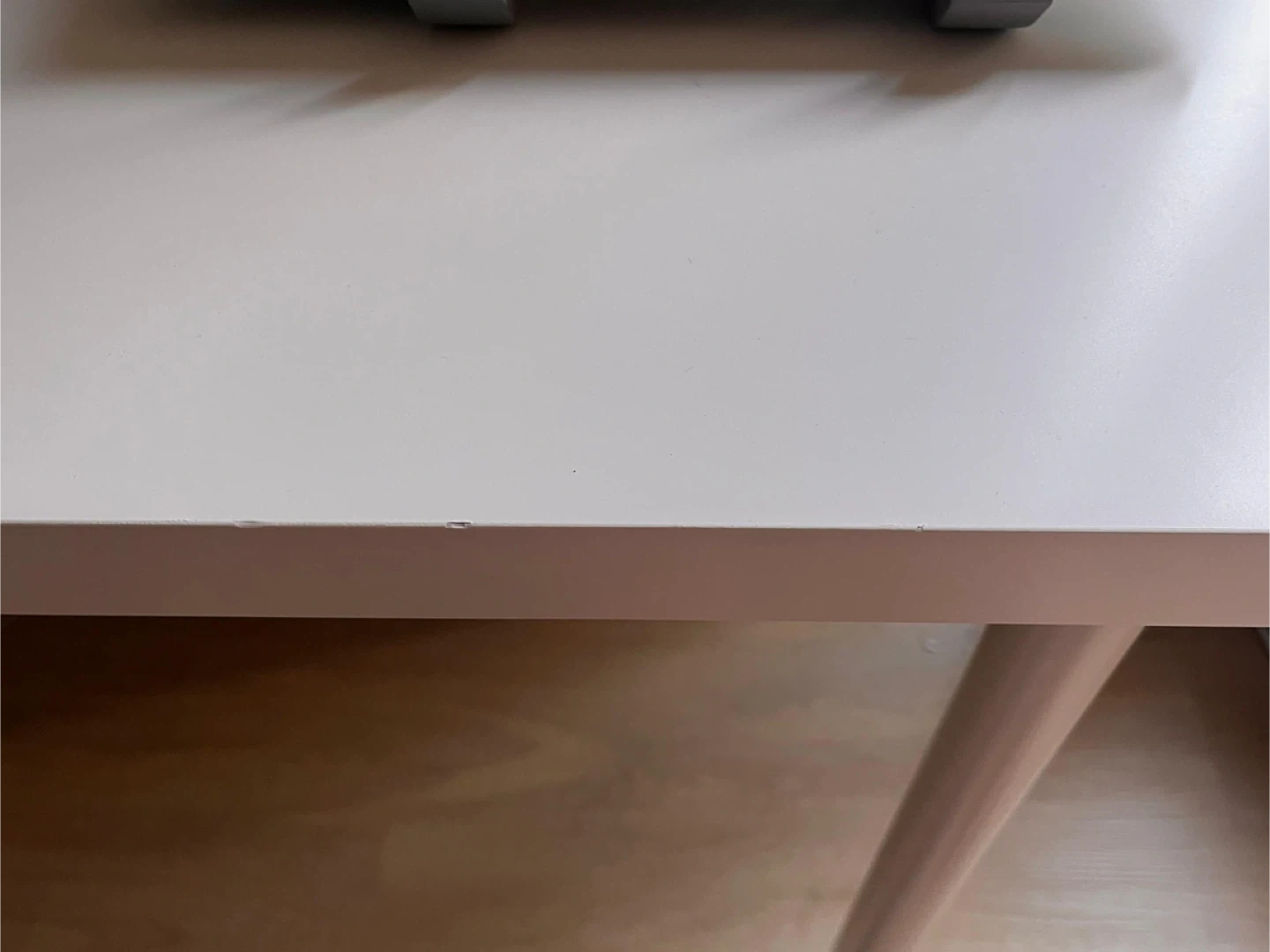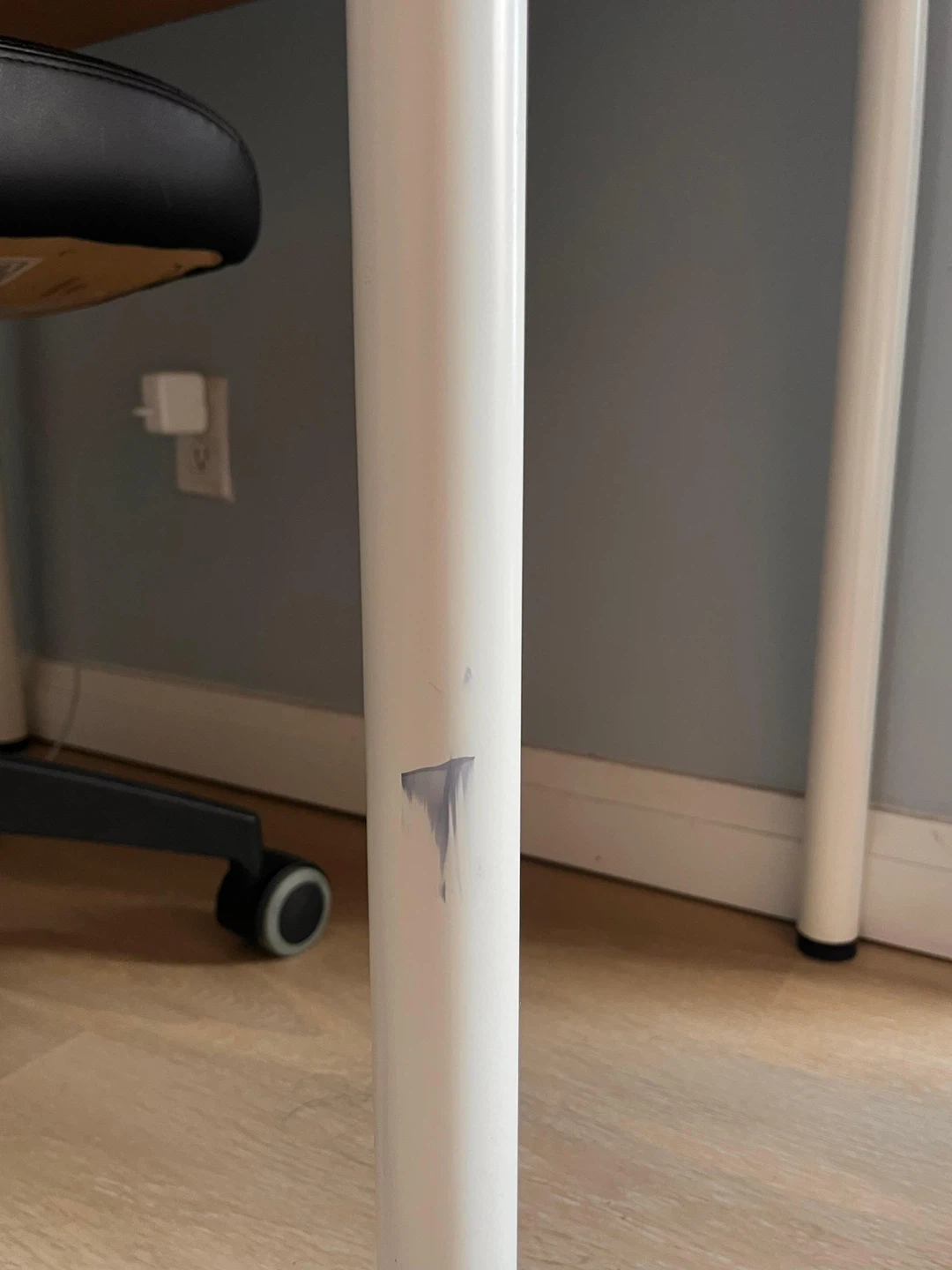 A sturdy white desk with metal legs and a clean, minimalist design. Shows some minor scuffs on the surface from regular use and has a marker spot on one of the legs.