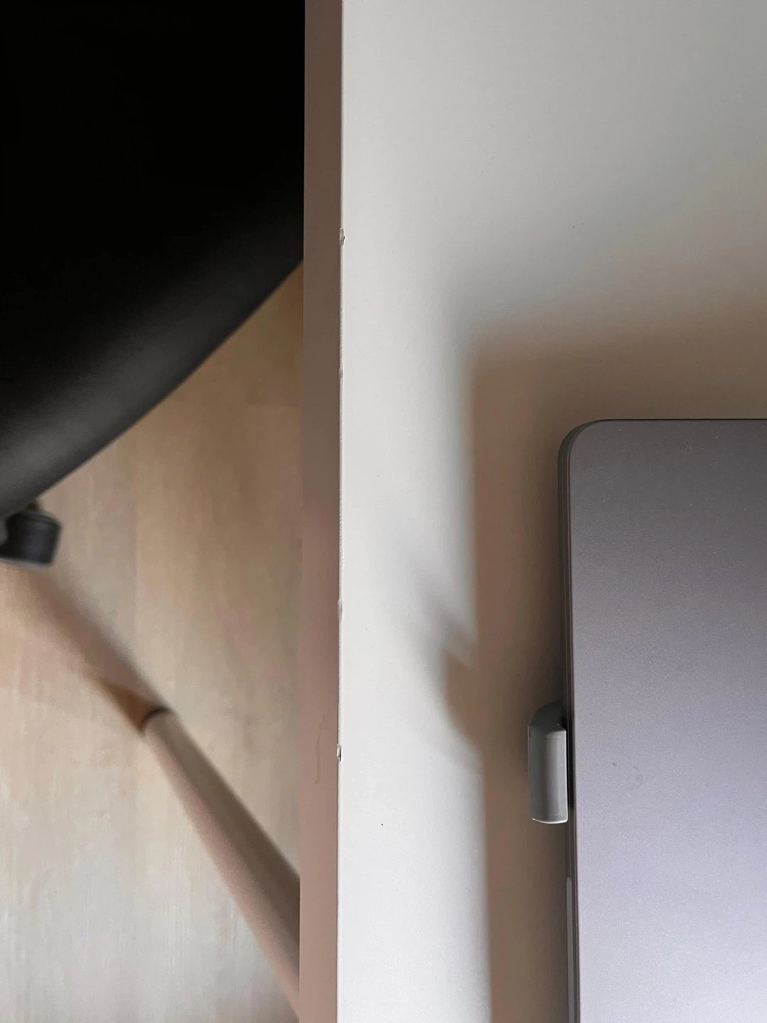 A sturdy white desk with metal legs and a clean, minimalist design. Shows some minor scuffs on the surface from regular use and has a marker spot on one of the legs.