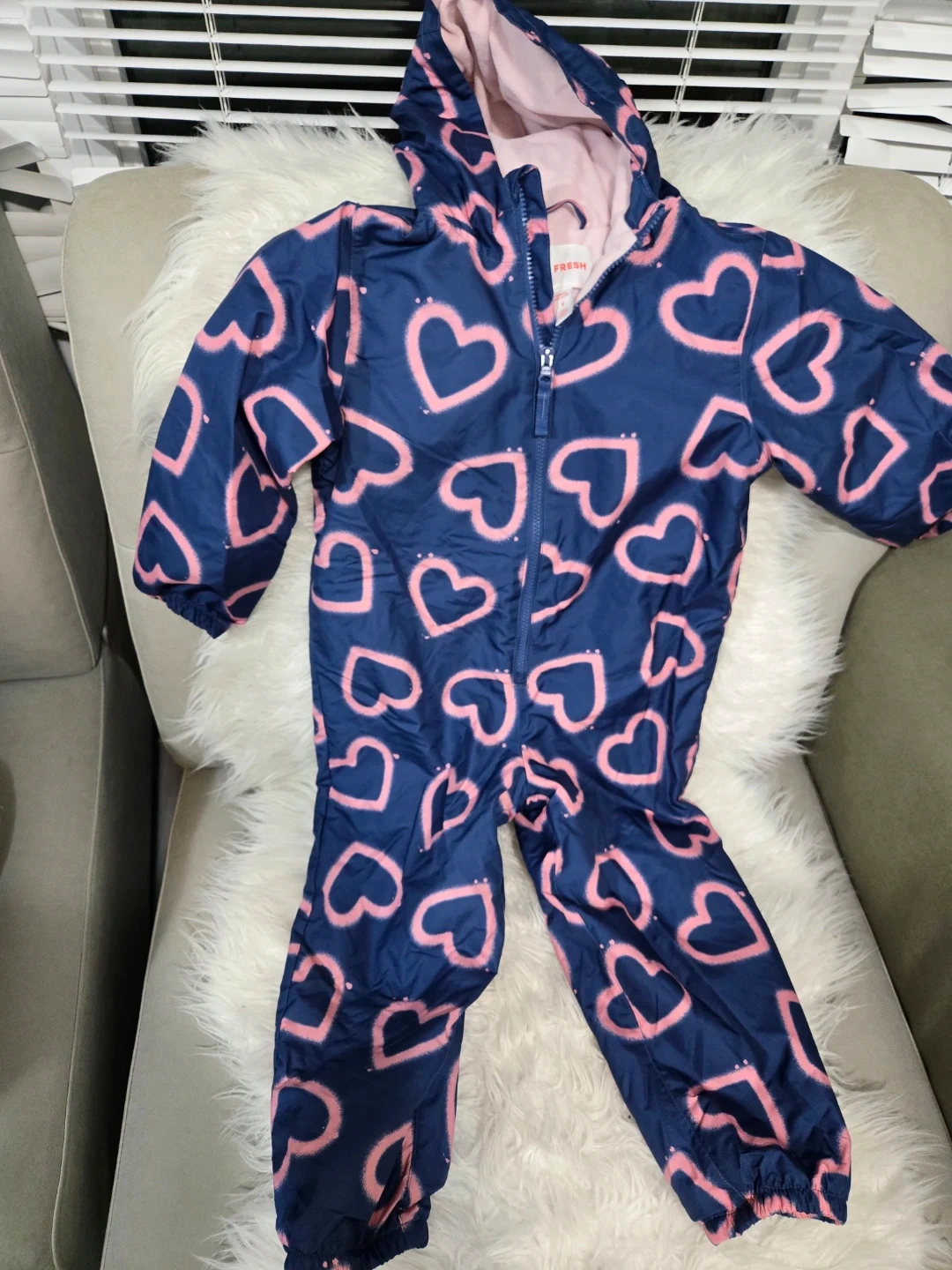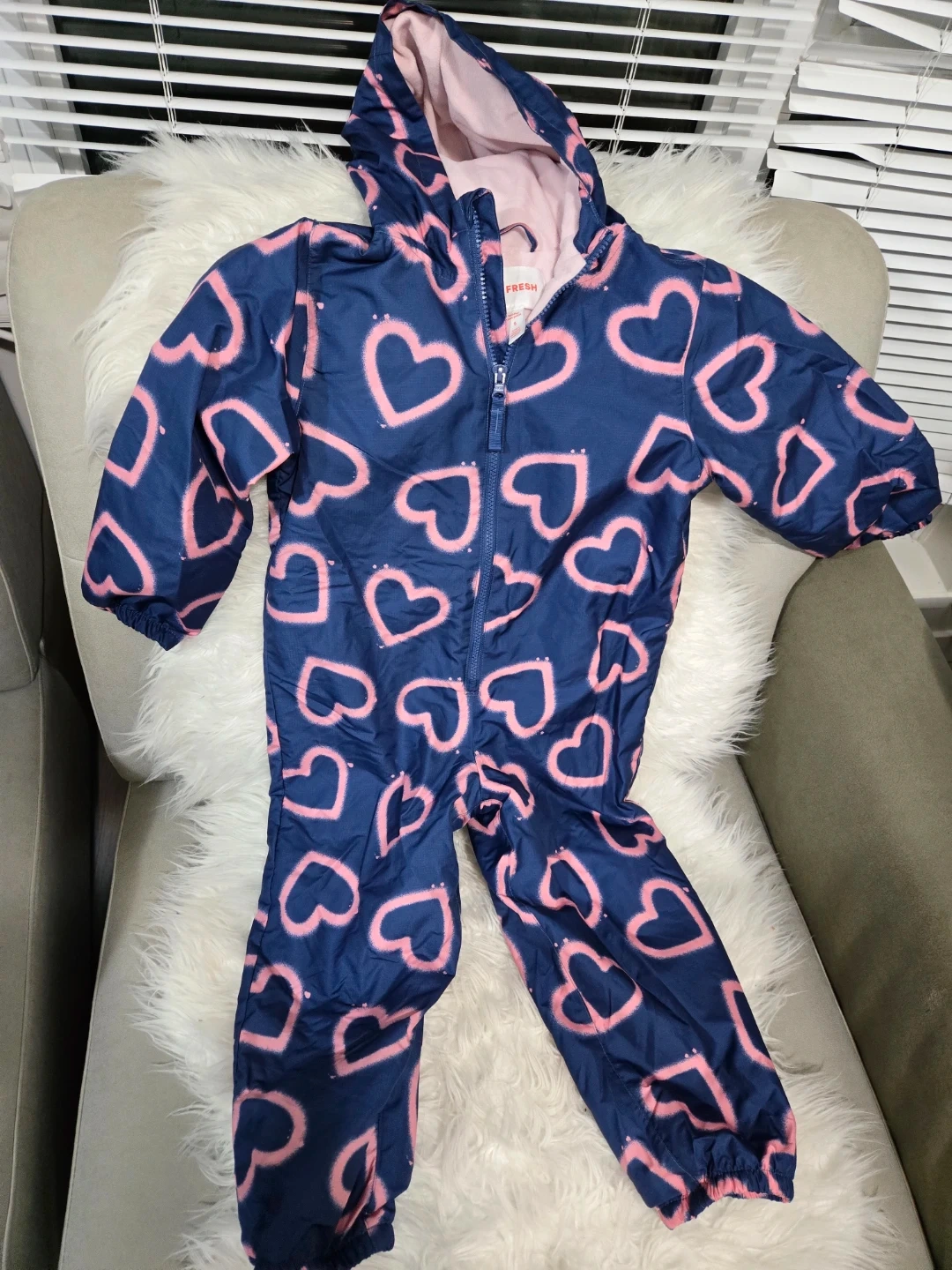Keep your little one warm and stylish in this adorable Fresh kids snowsuit! The snowsuit features a cute heart pattern on a navy blue background, with a soft pink lining. Perfect for winter adventures and snowy days or rainy days, uses only few times like new