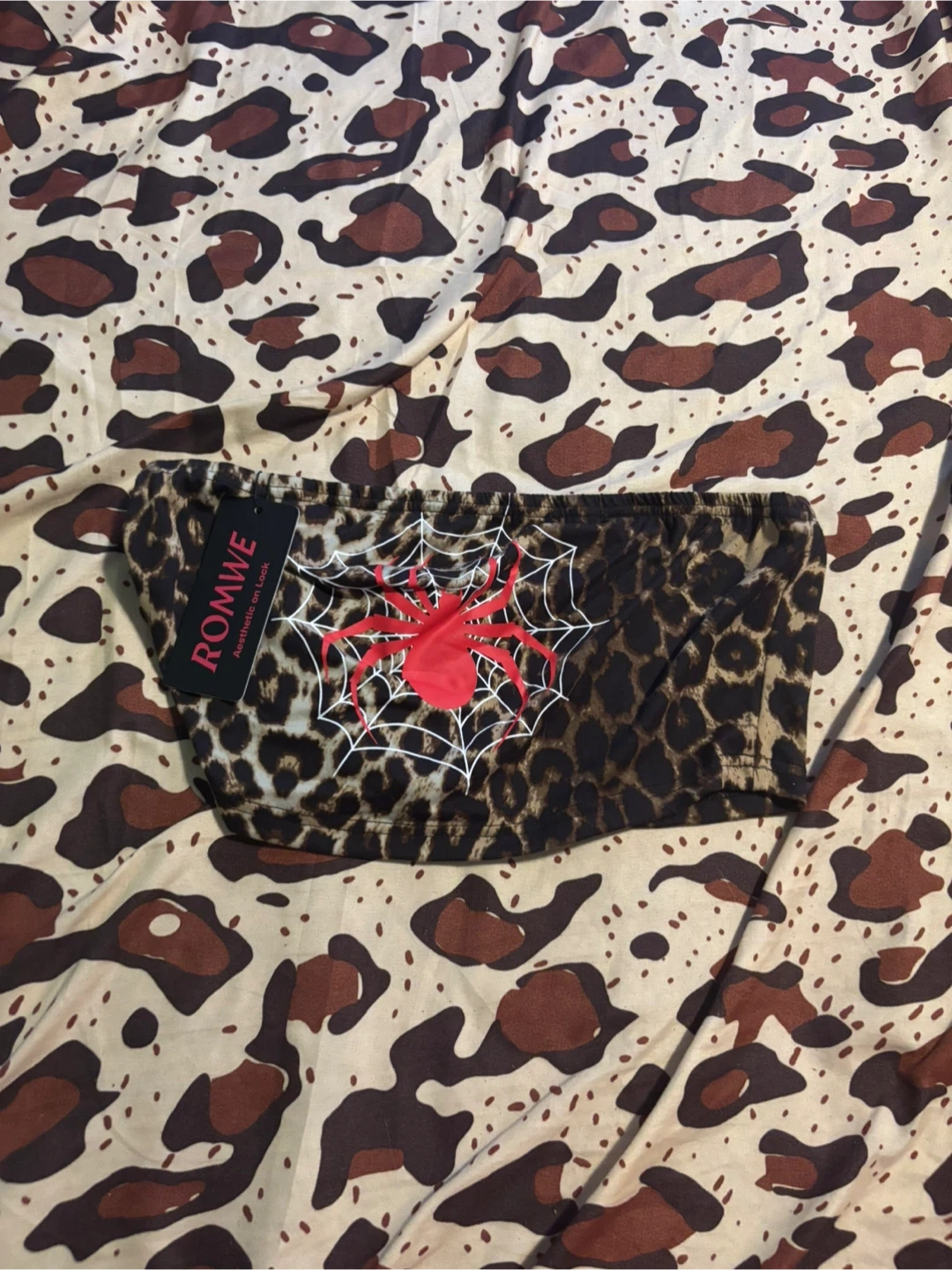 This ROMWE tube top features a leopard print with a red spider web graphic. It's a fun, eye-catching piece for any wardrobe. Material appears to be a stretchy blend.