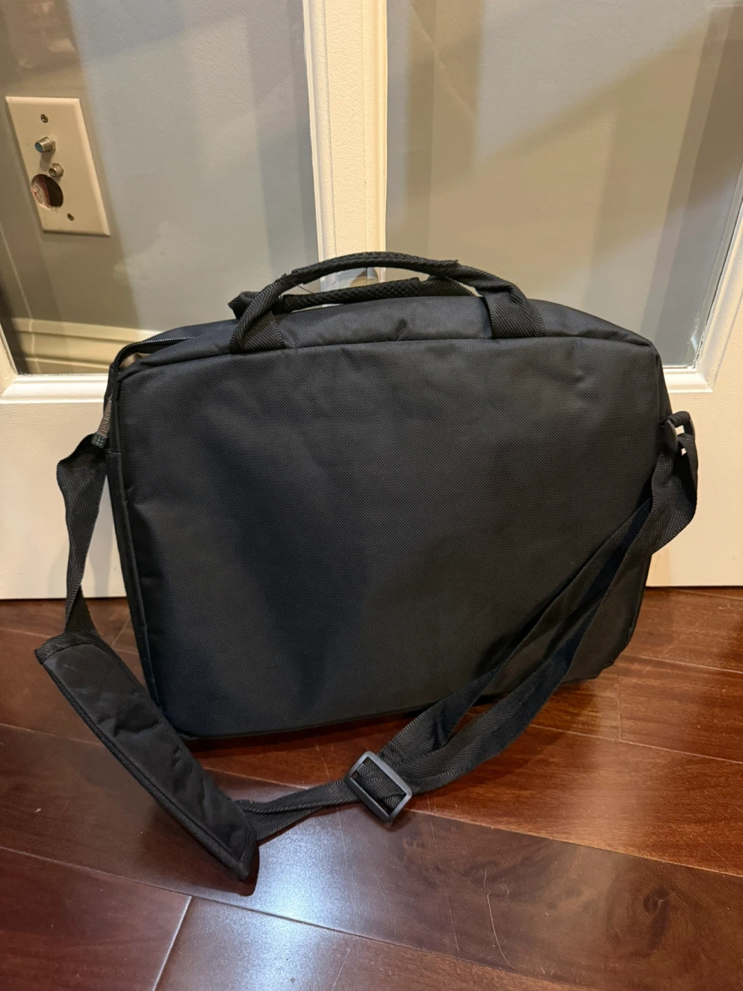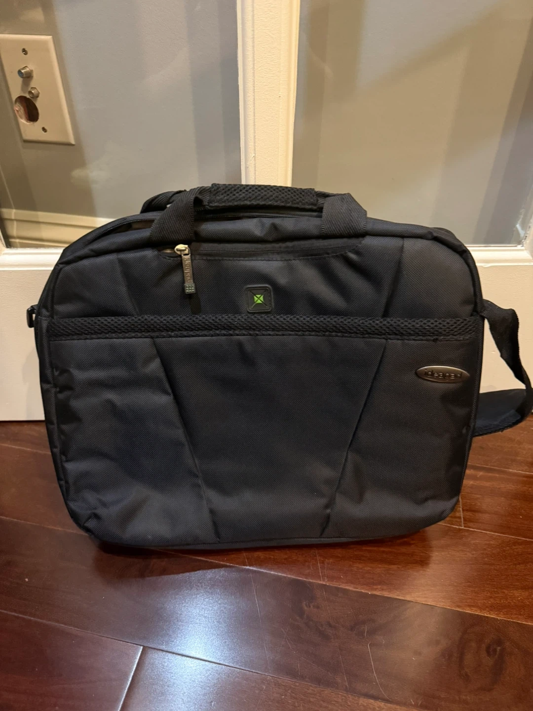 This is a black Targus laptop bag. It has a main compartment and a front pocket for accessories. The adjustable shoulder strap is detachable.