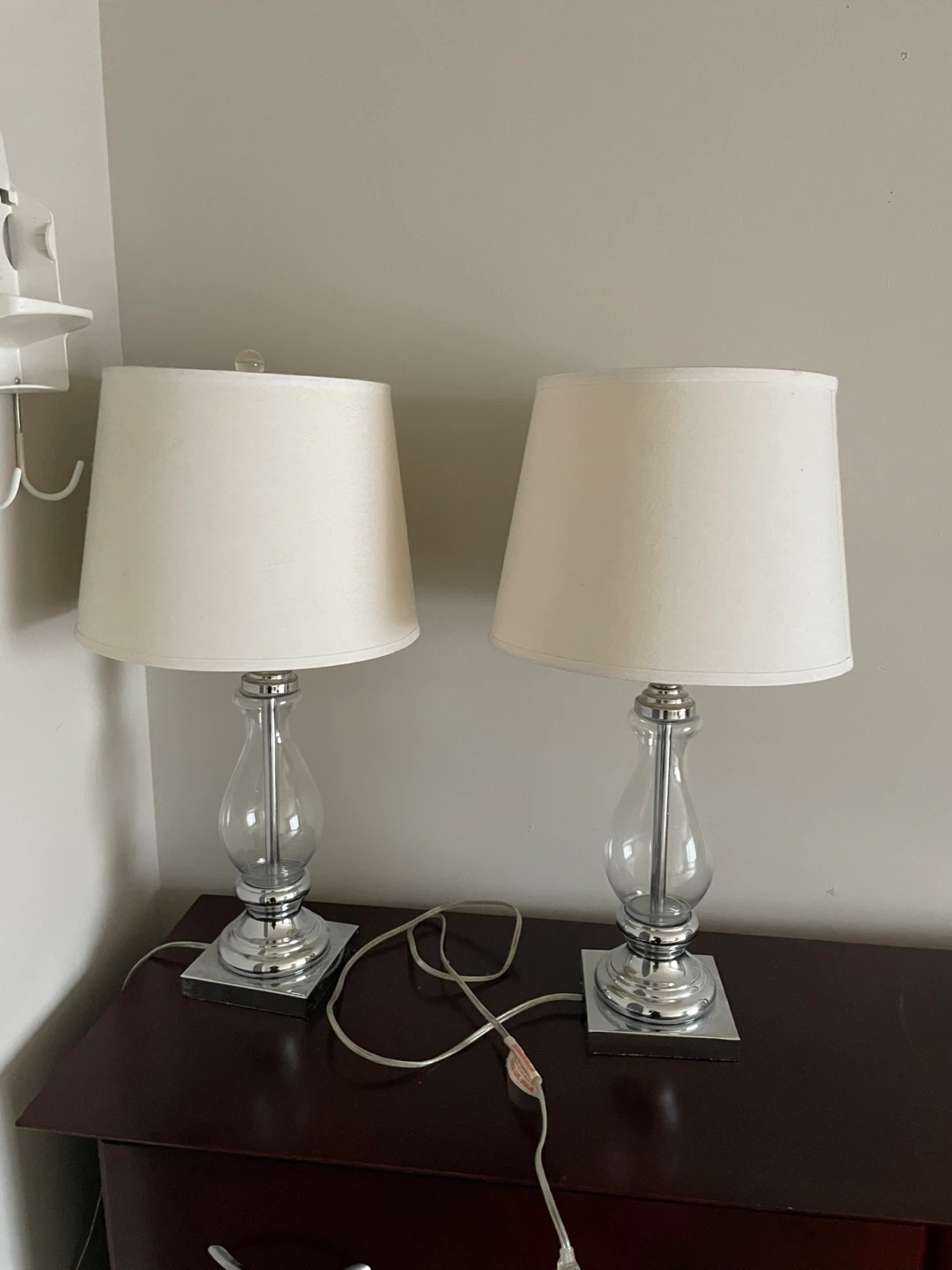 Two table lamps with clear glass bases and chrome accents. They have off-white fabric lampshades. These lamps' bases are made of glass and metal. They would add a touch of elegance to any room.