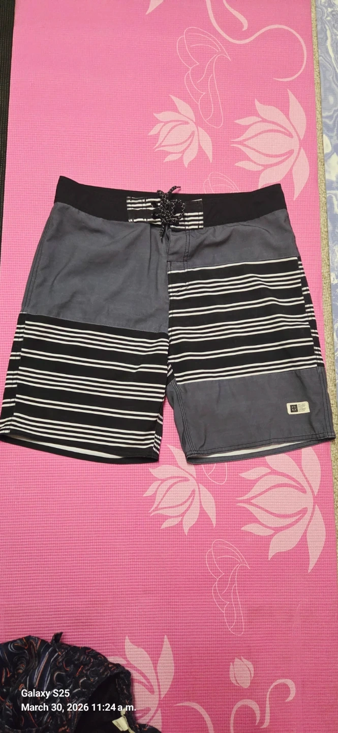 Board shorts made from 92% polyester and 8% spandex. These shorts feature a drawstring waist and a mix of solid grey and striped panels.