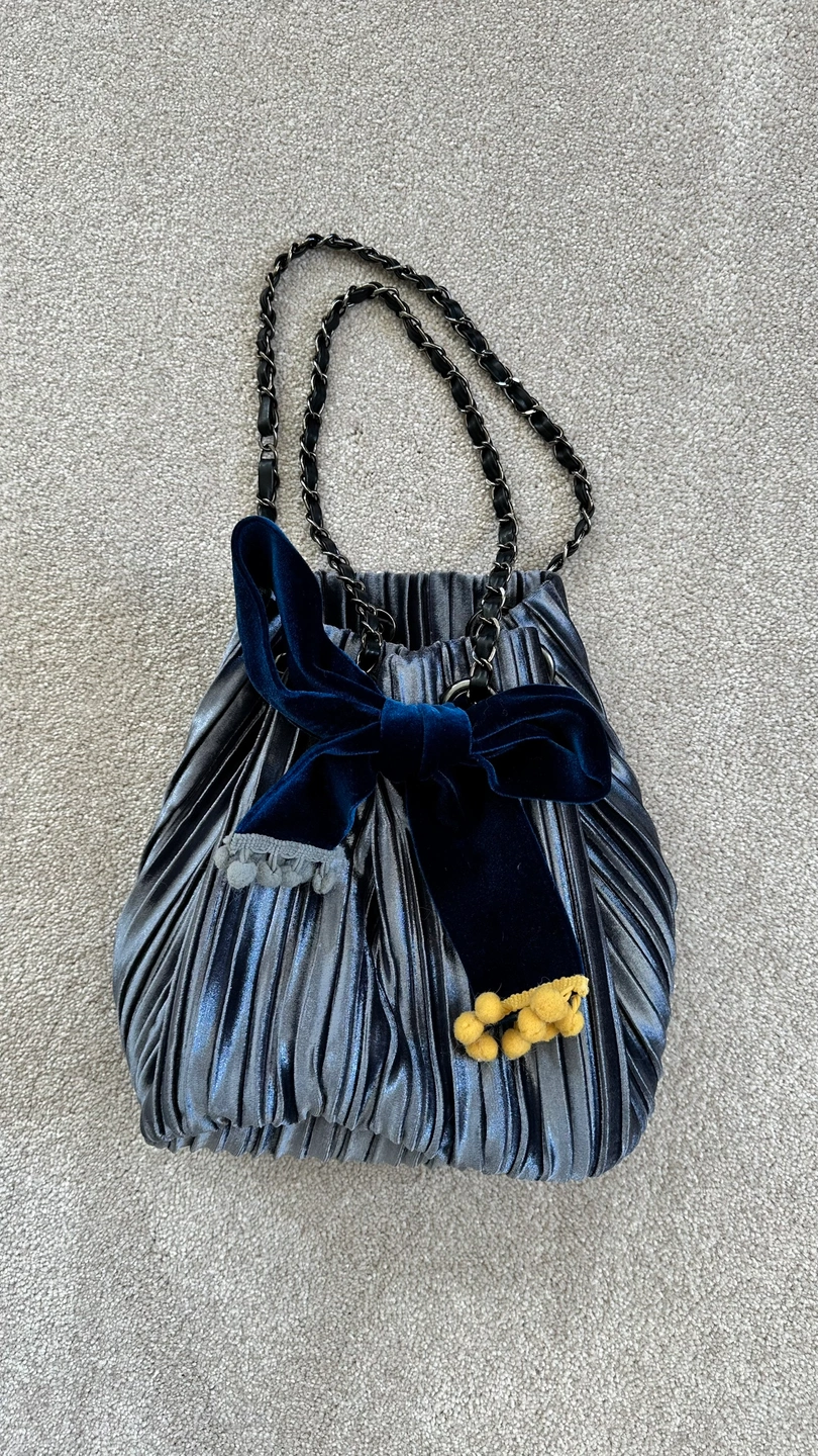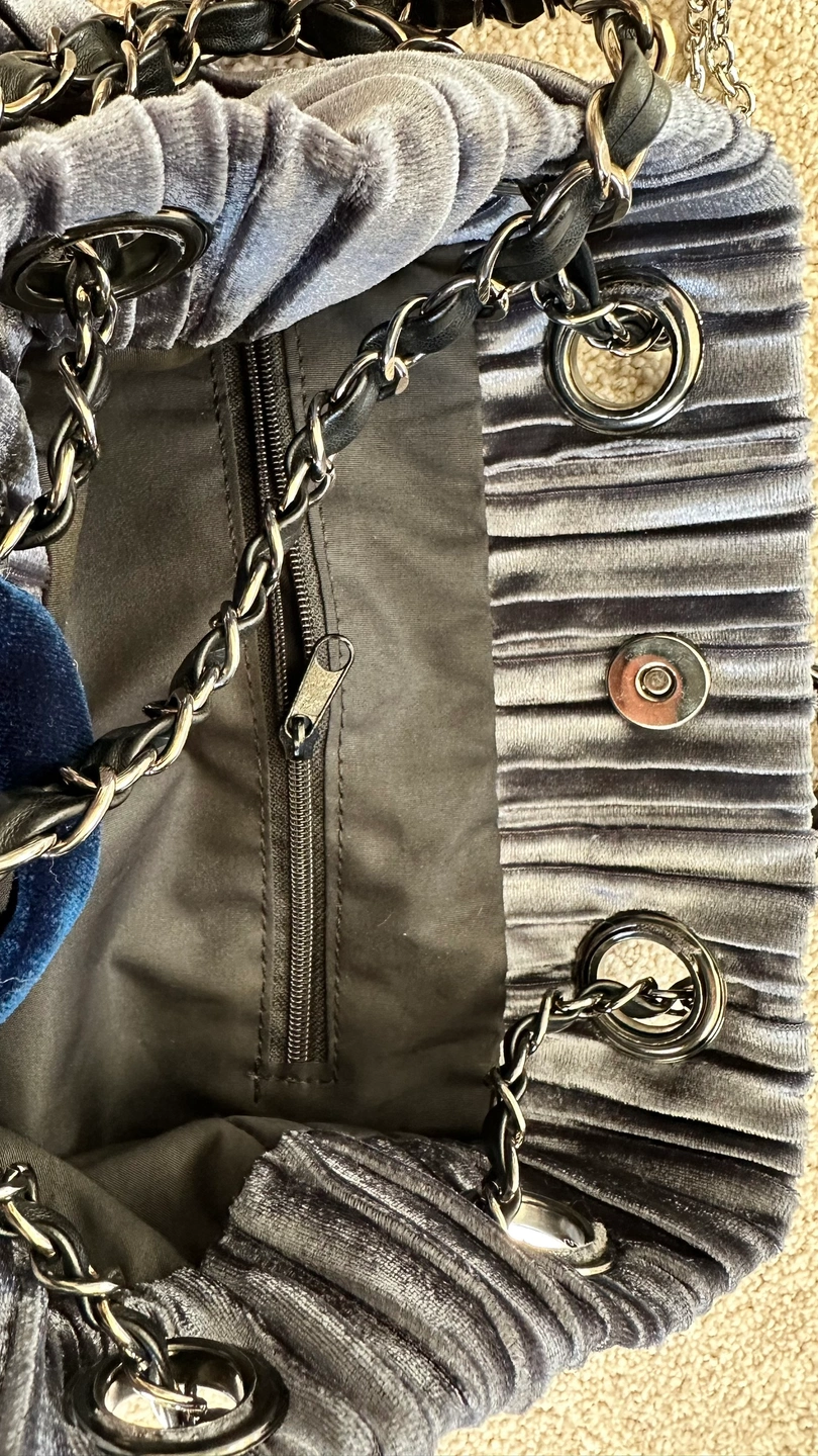 medium, corduroy, ribbed, embellished, brand logo, solid color, lace-up, fully lined, internal pockets and pleated blue velvet handbag with a chain strap and a large blue velvet bow. The bag has a zipper closure and a magnetic snap closure. The interior of the bag has a small pocket.