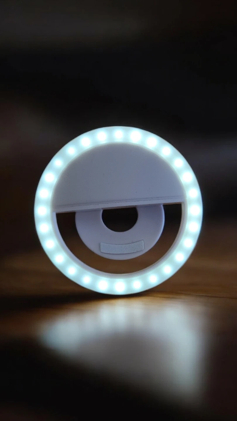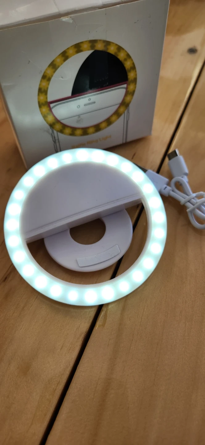 This is a clip-on ring light designed for phones. It's perfect for improving selfies and videos. The light has multiple LEDs for bright illumination. Includes charging cable.