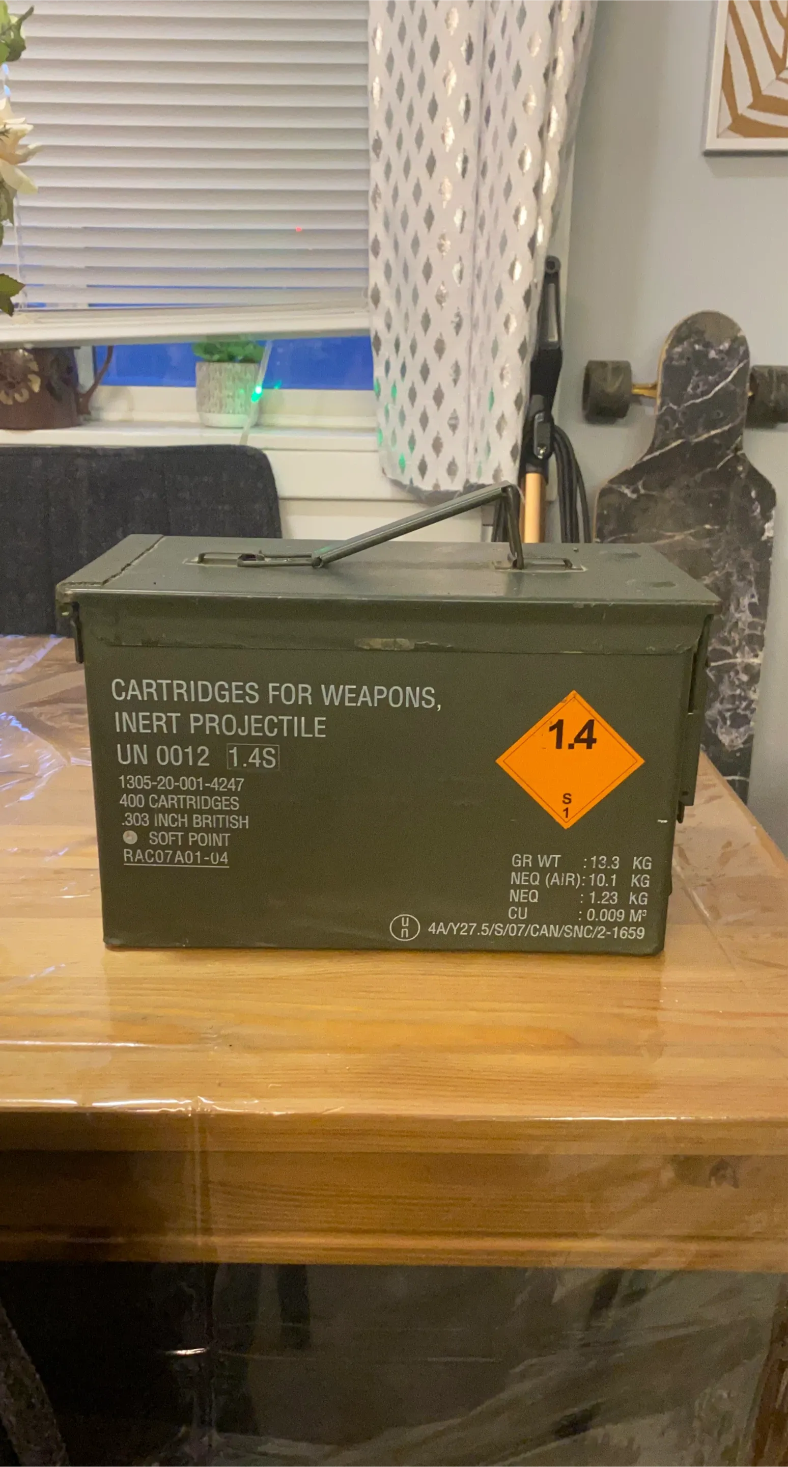Selling an ammunition box designed for weapons and inert projectiles. It has the markings UN 0012 1.4S and is labeled for 400 cartridges of .303 inch British soft point ammunition. It's marked with a gross weight of 13.3 kg and a net explosive quantity (air) of 10.1 kg