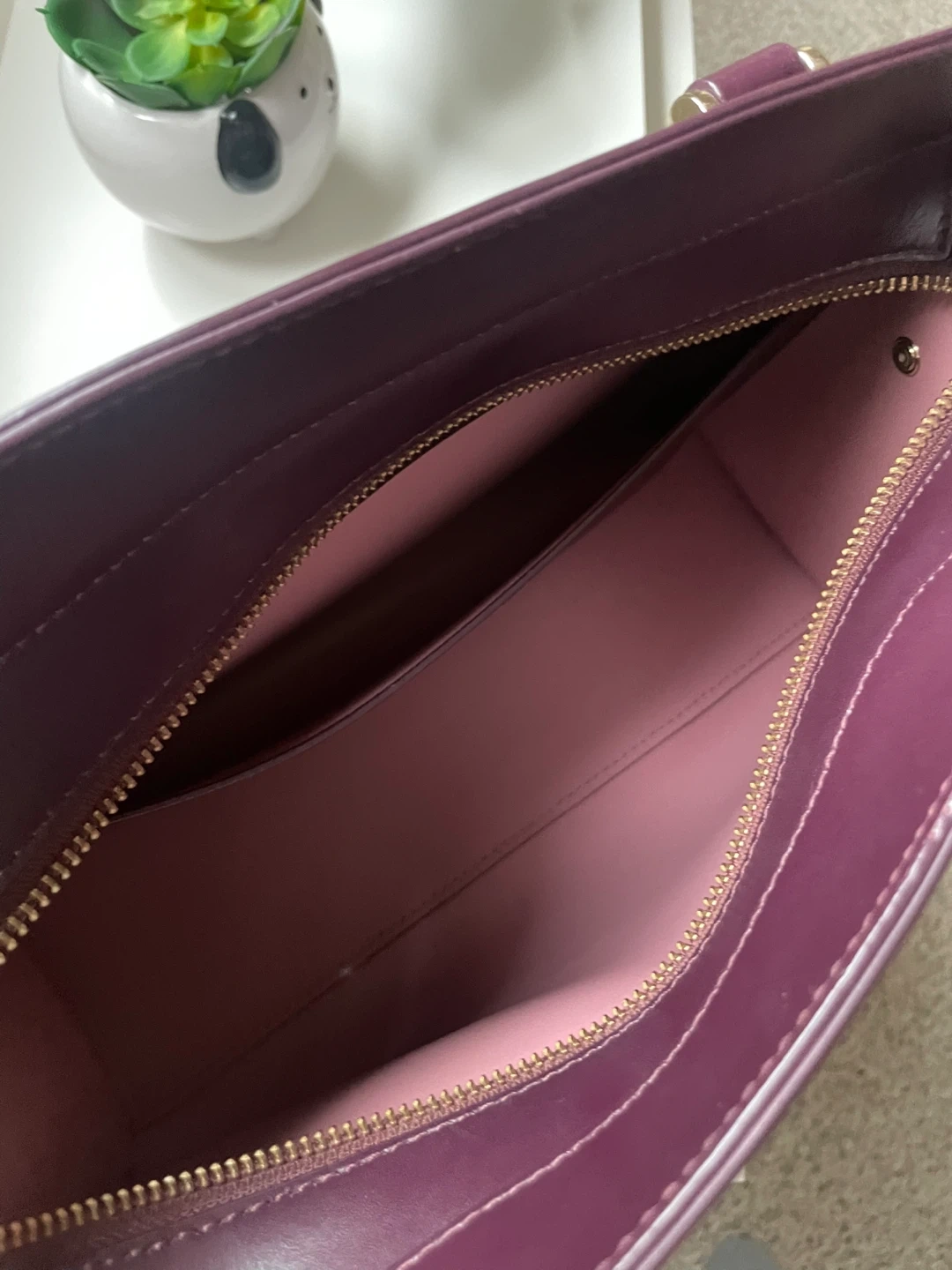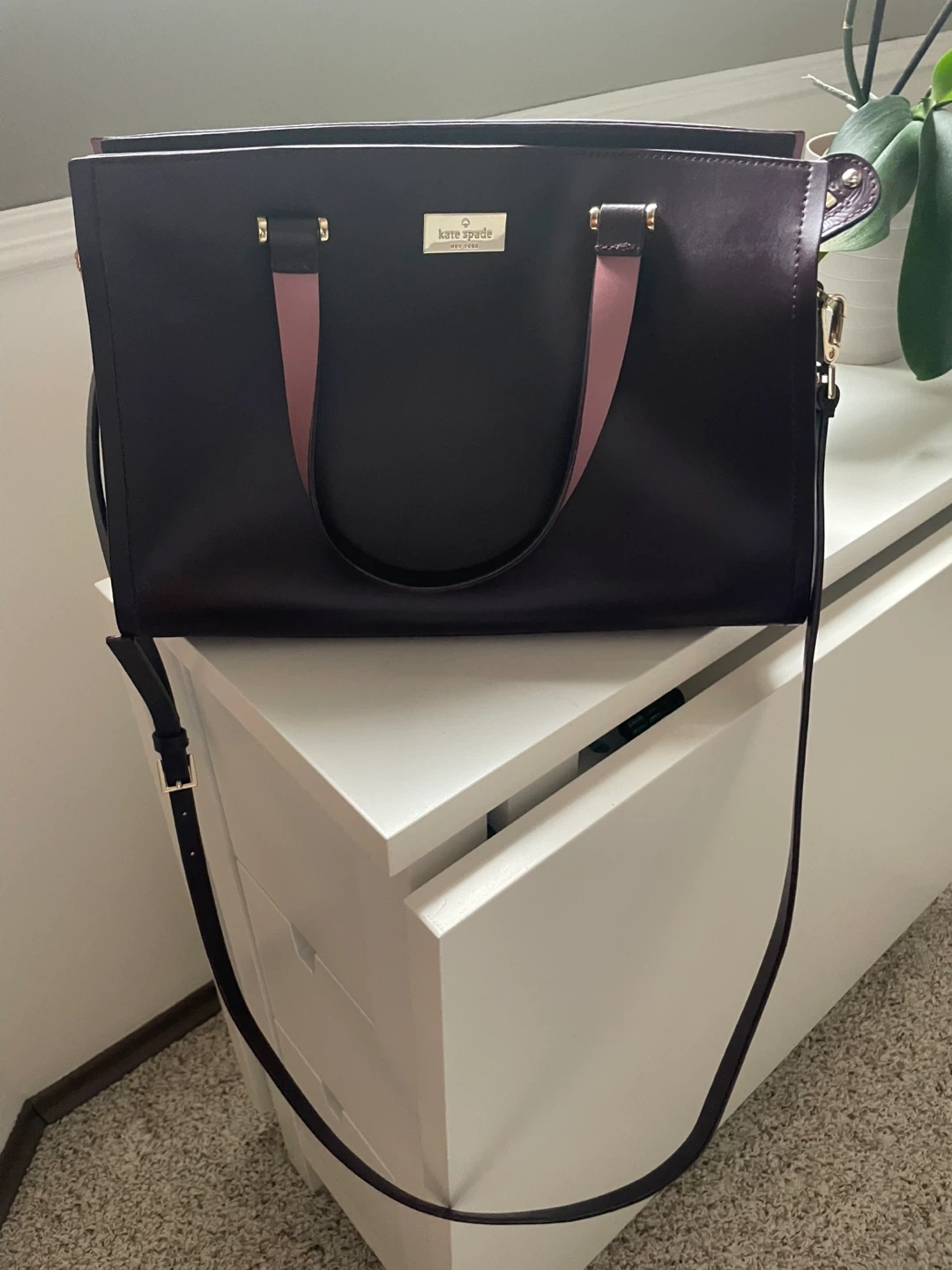 This Kate Spade New York tote bag is a deep plum colour with lighter pink accents on the straps. It's made of leather and features an interior zip pocket. This bag is perfect for everyday use!