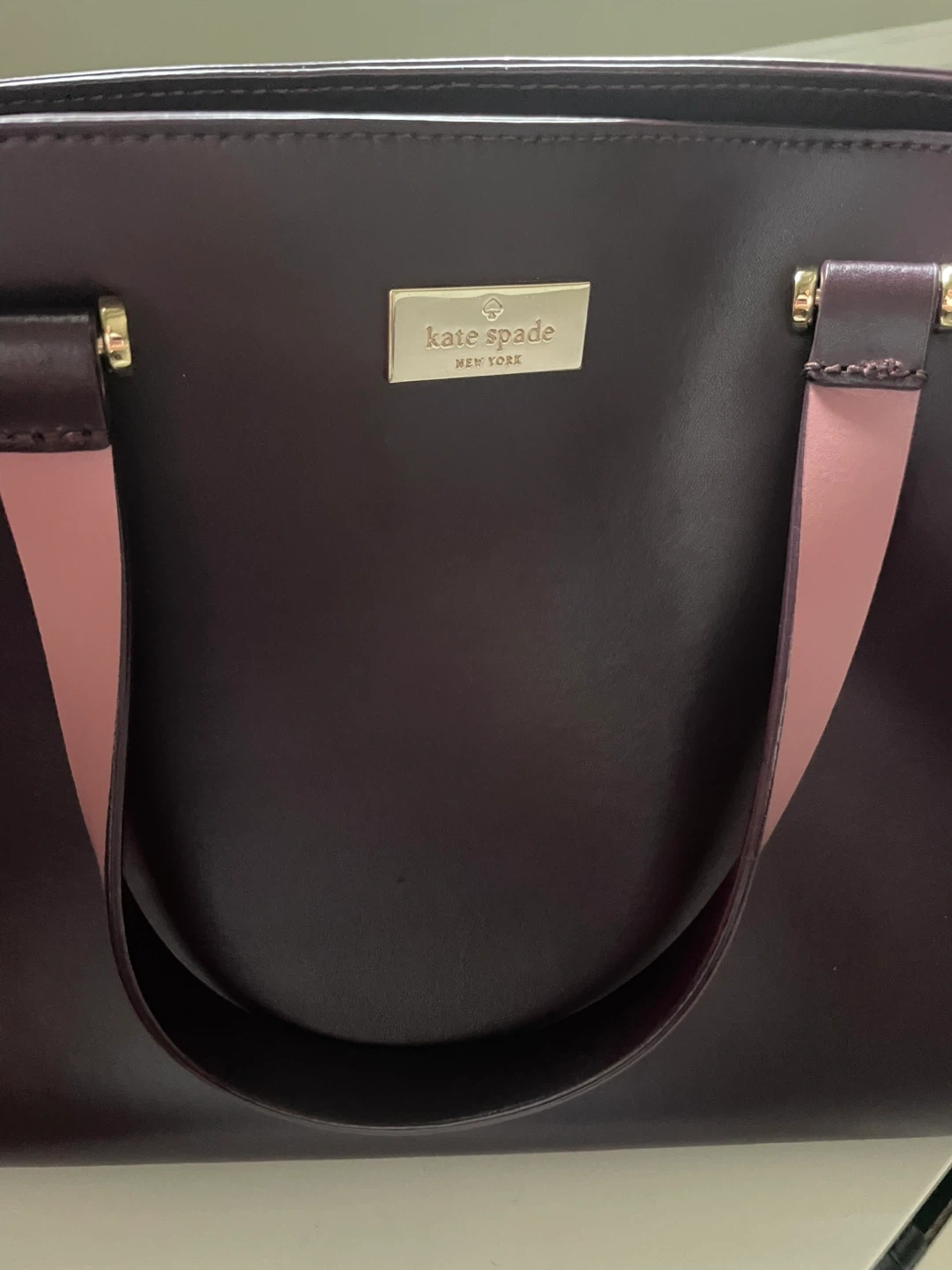 This Kate Spade New York tote bag is a deep plum colour with lighter pink accents on the straps. It's made of leather and features an interior zip pocket. This bag is perfect for everyday use!