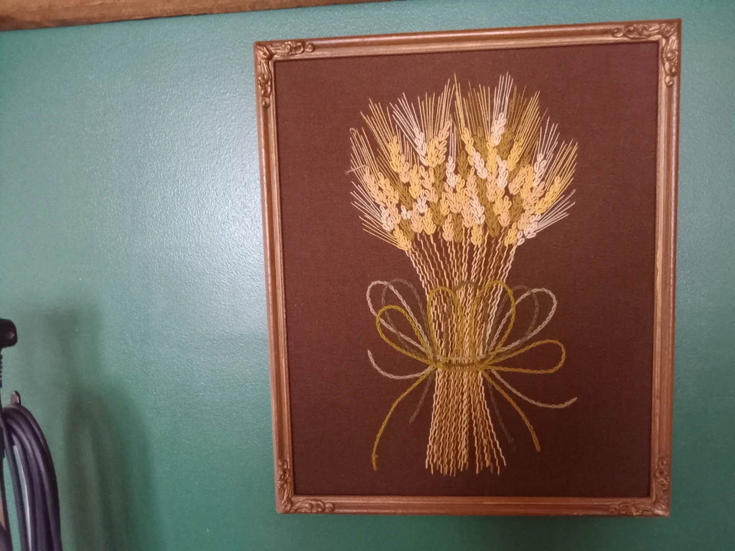 This is a framed embroidery art piece featuring a bundle of wheat stalks. The embroidery is on a brown background and is framed with a decorative gold-colored frame. It's a lovely piece for home decor!
