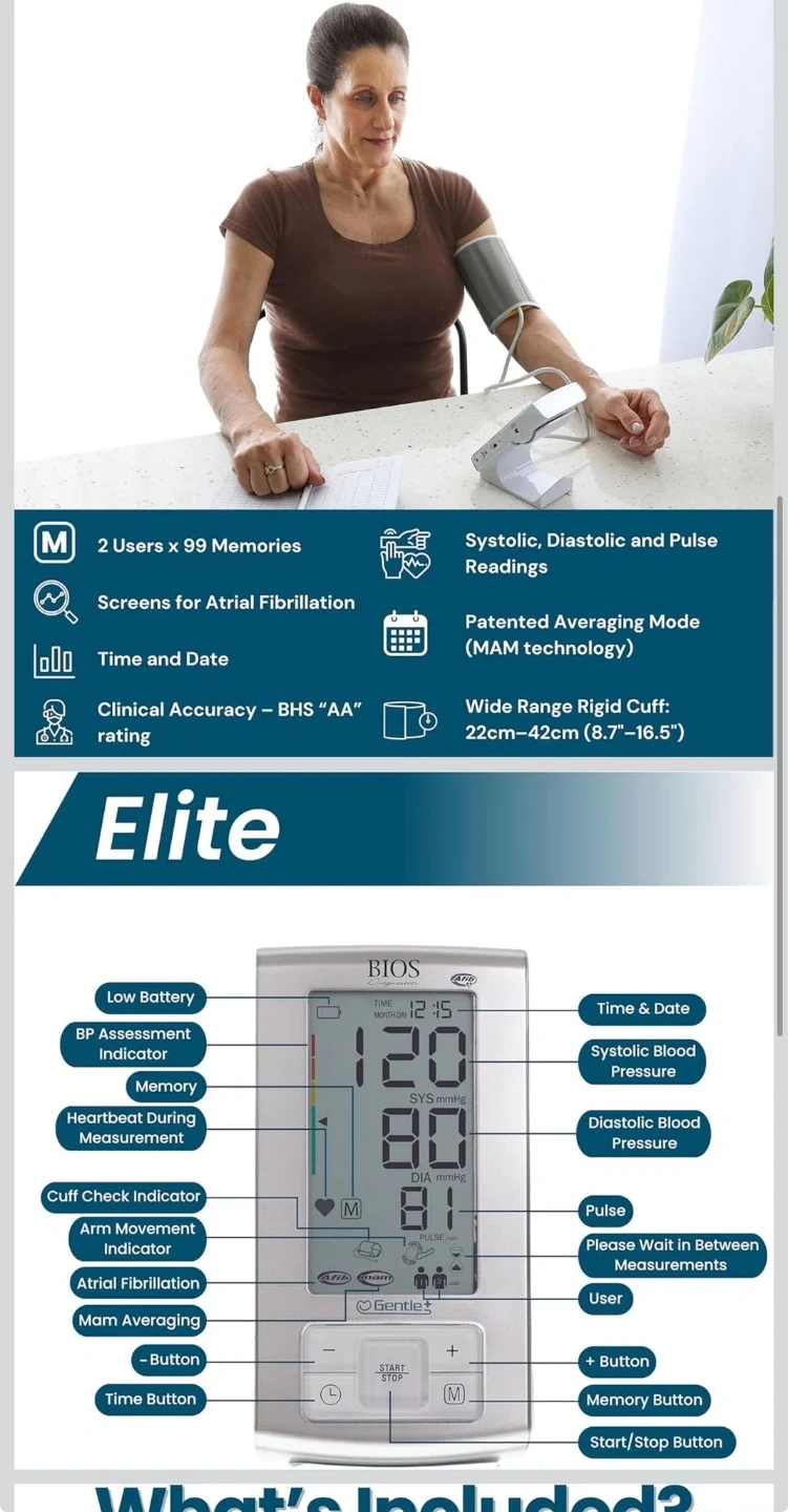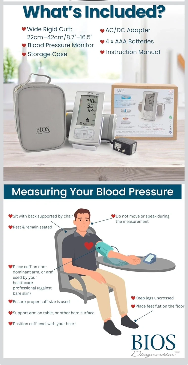 BIOS Diagnostics Elite Blood Pressure Monitor. Features include 2 users x 99 memories and patented averaging mode (MAM technology). The wide-range rigid cuff fits 22cm-42cm (8.7"-16.5"). Includes AC/DC adapter, 4 x AAA batteries, and instruction manual.