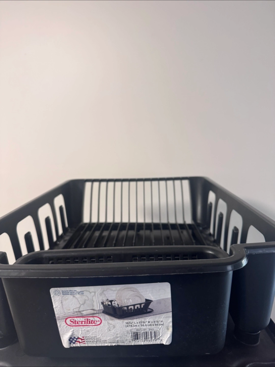 Selling a Sterilite dish rack in black! It measures 18 3/4" L x 13 3/4" W x 5 1/2" H (47.6 cm x 34.9 cm x 14 cm). Great for keeping your dishes organized after washing