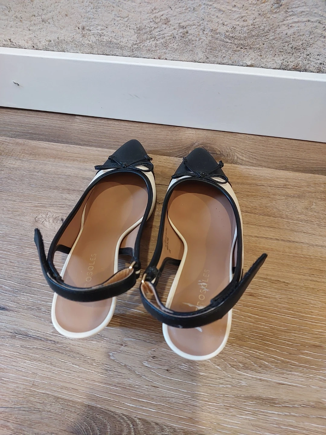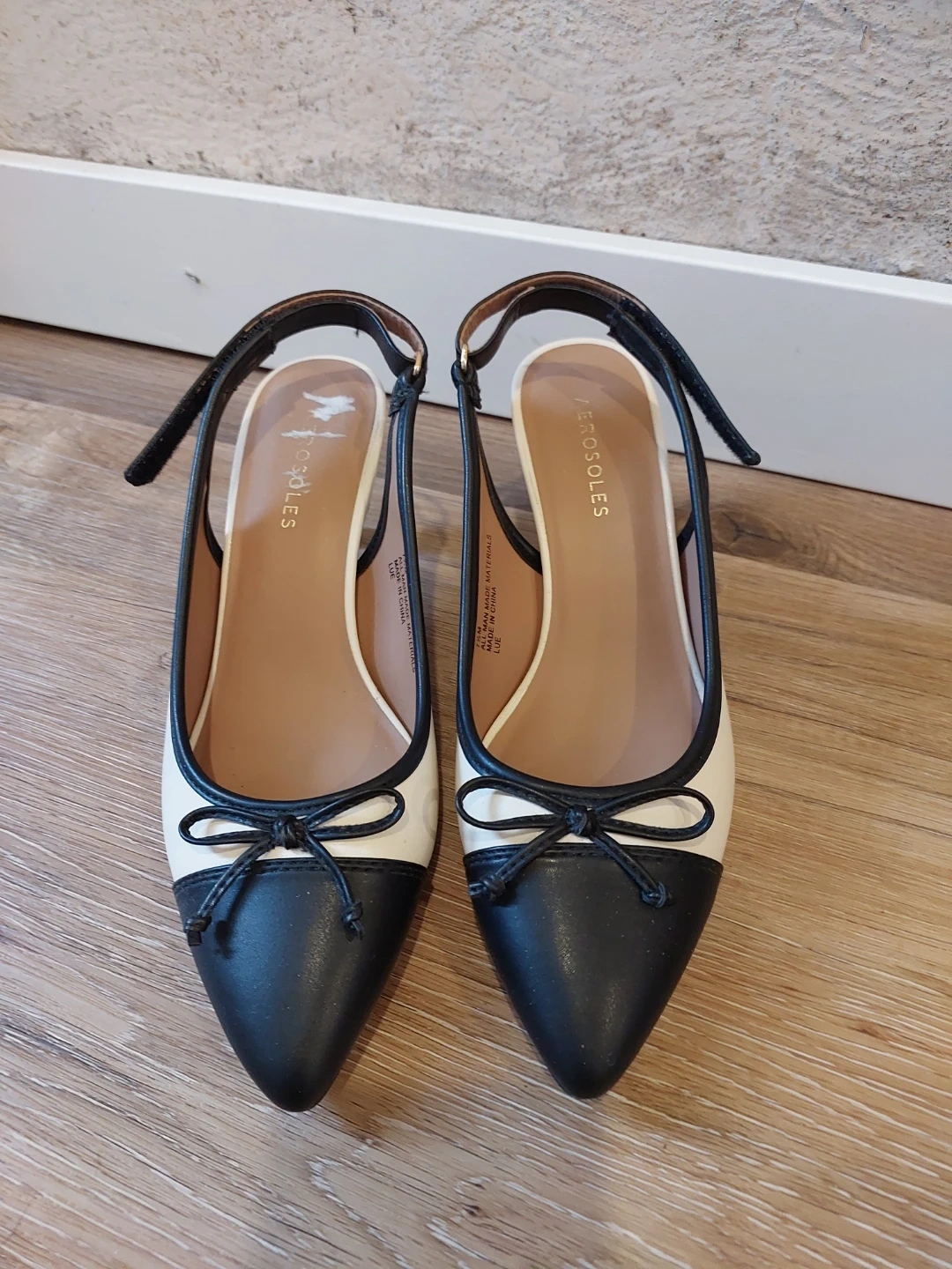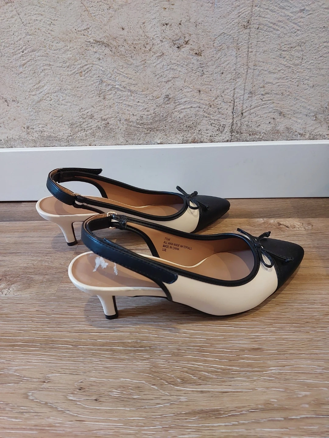 These Aerosoles slingback heels feature a classic black and white design with a small bow accent. The adjustable ankle strap ensures a comfortable fit. They're made with all man-made materials. Perfect for a polished look!