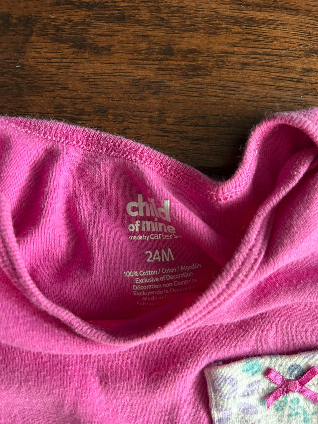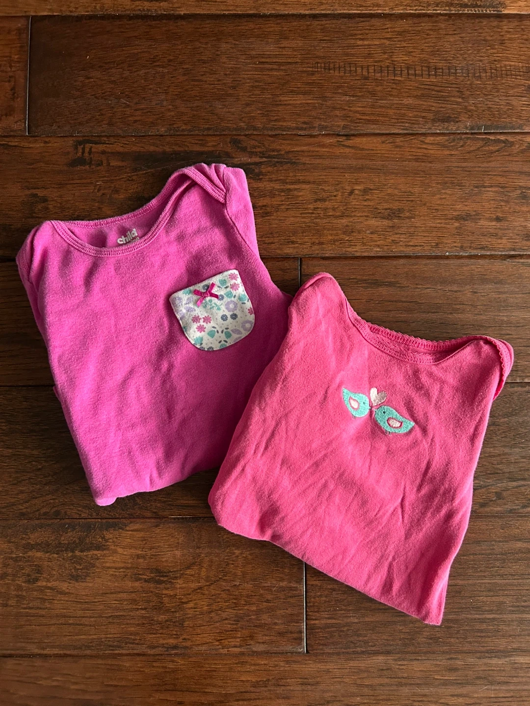 Two pink long-sleeved bodysuits from Carter's. One has a floral pocket detail, and the other has a bird applique. Size 24M. Great for everyday wear!