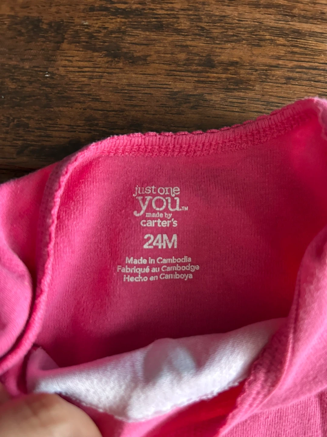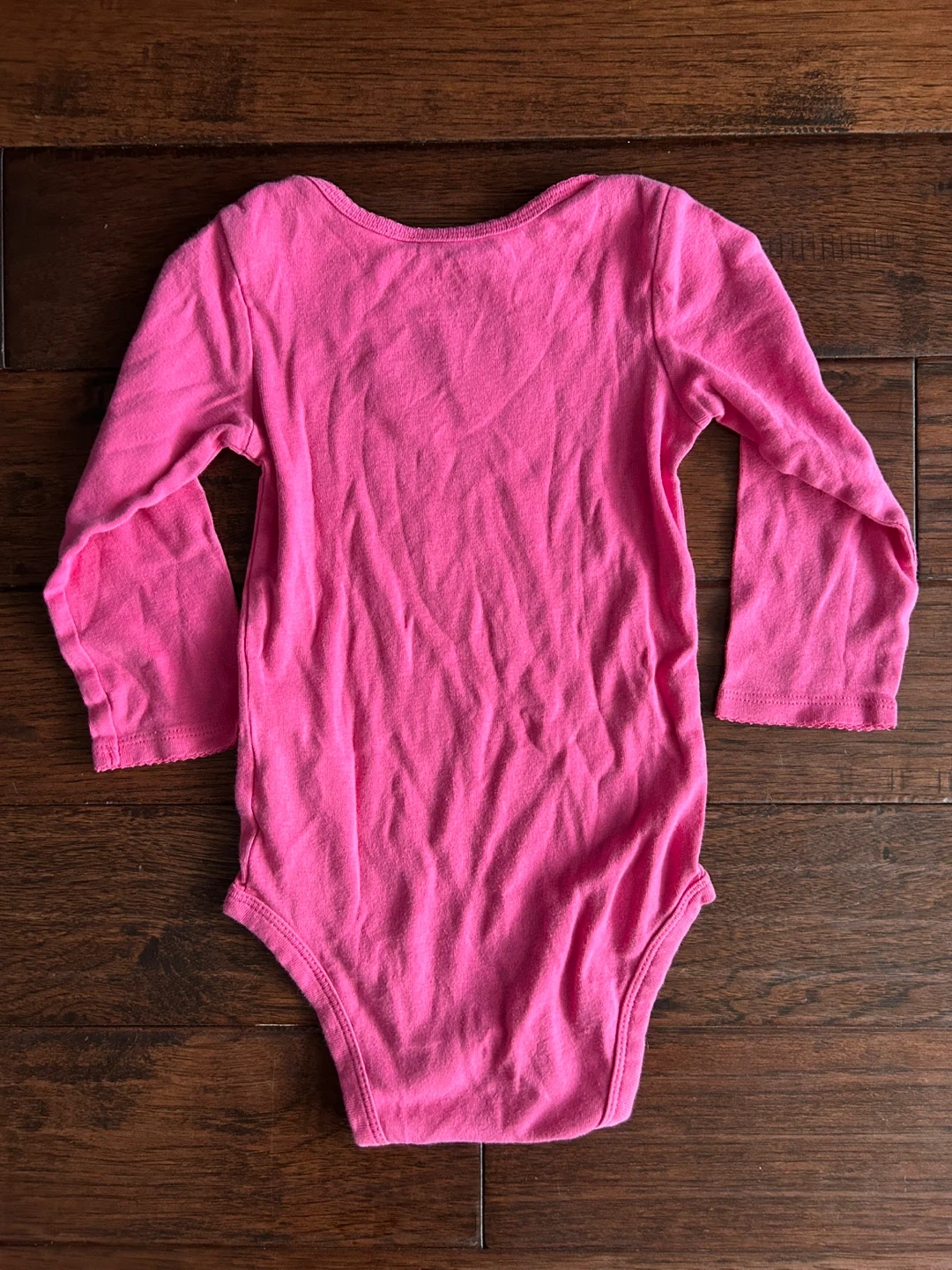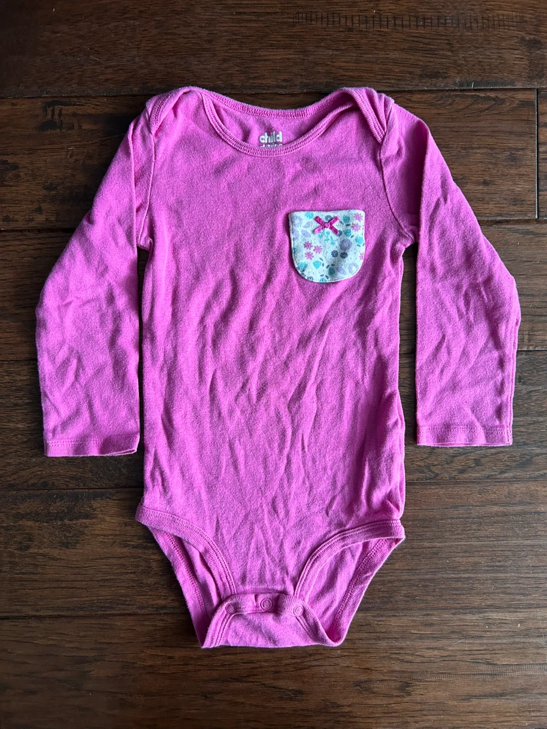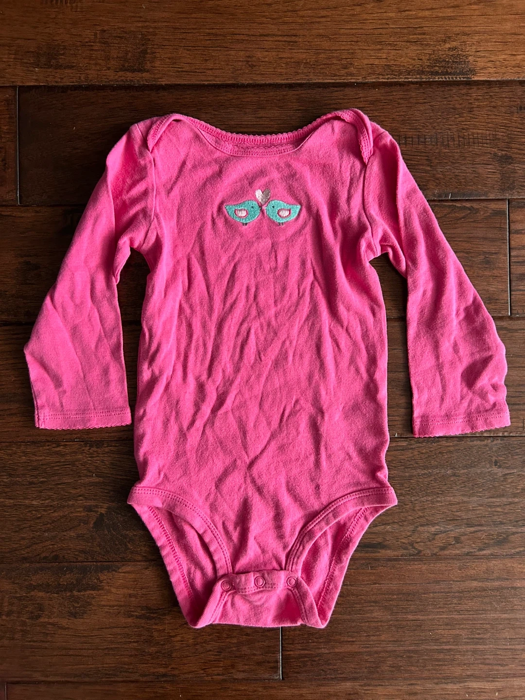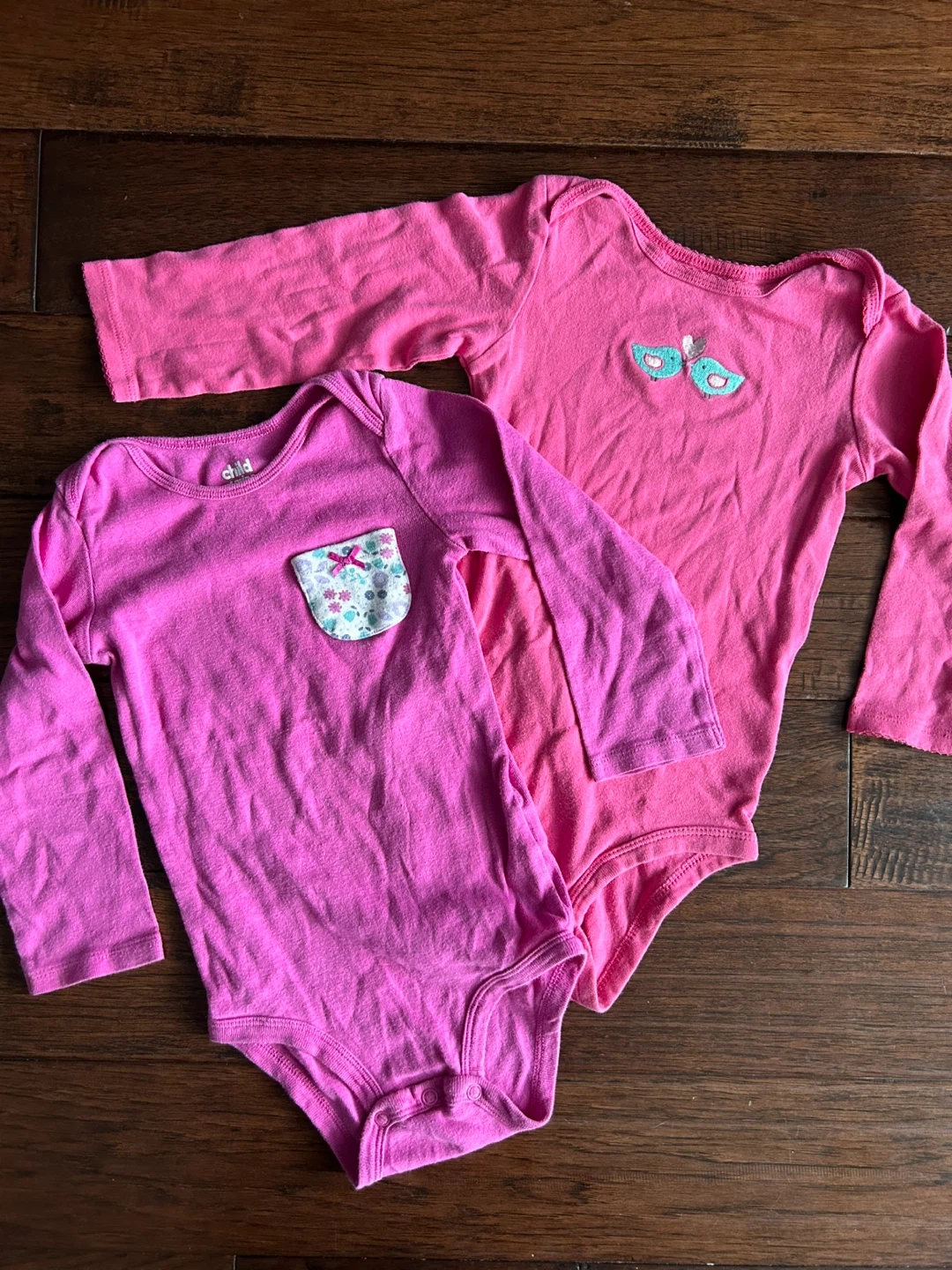 Two pink long-sleeved bodysuits from Carter's. One has a floral pocket detail, and the other has a bird applique. Size 24M. Great for everyday wear!