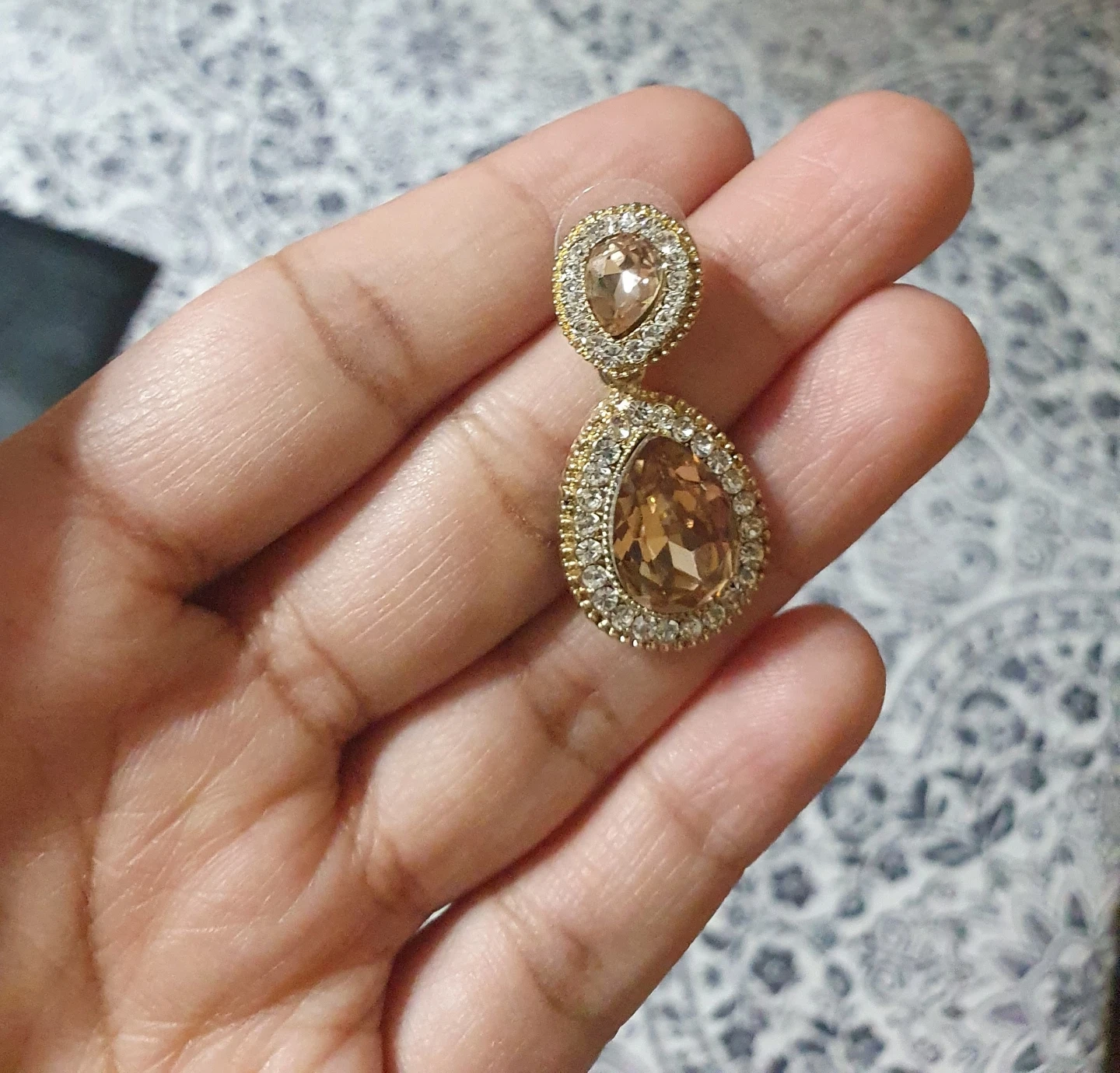 These beautiful earrings feature a teardrop design surrounded by sparkling rhinestones, perfect for adding a touch of glamour to any outfit