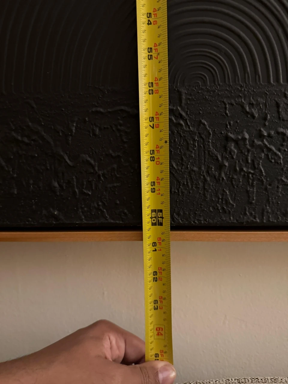 Selling a modern abstract wall art piece! It features a textured design with a geometric pattern of circles and half-circles in neutral tones. The frame is a warm wood color. It measures approximately 47 inches wide and 64 inches tall, making it a statement piece for any room!
