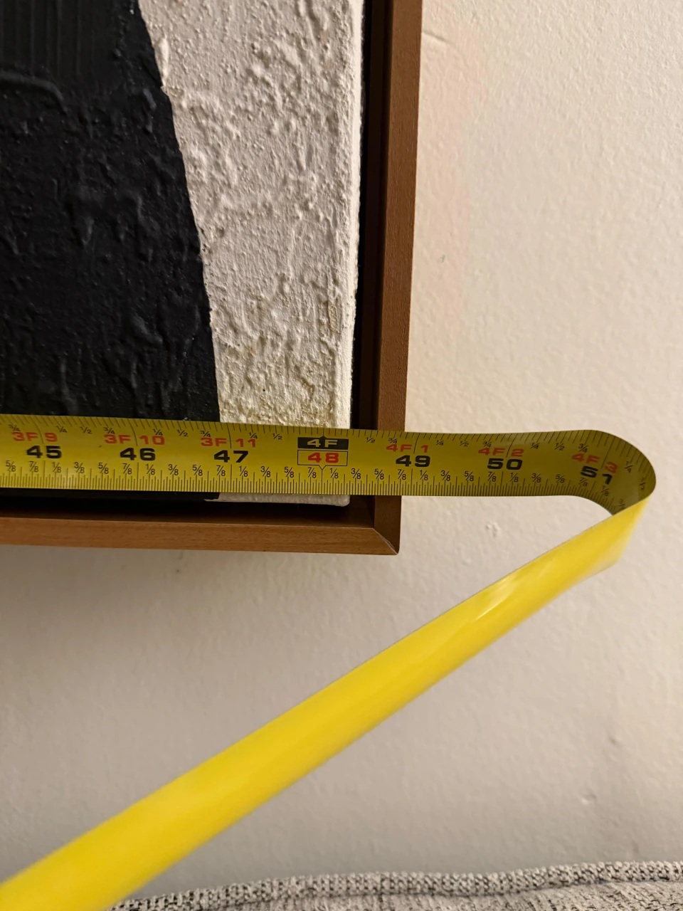 Selling a modern abstract wall art piece! It features a textured design with a geometric pattern of circles and half-circles in neutral tones. The frame is a warm wood color. It measures approximately 47 inches wide and 64 inches tall, making it a statement piece for any room!