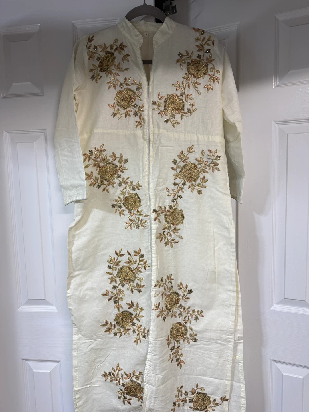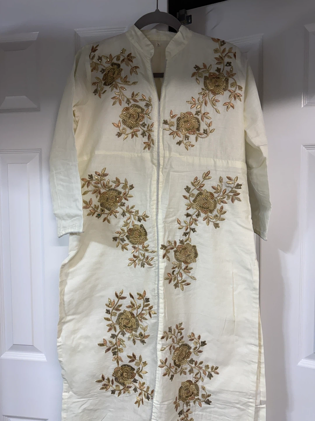 Cream coloured kurti or tunic featuring intricate gold floral embroidery all over. It has a band collar and full sleeves. Made from a light, breathable fabric, it's perfect for casual wear or dressing up.