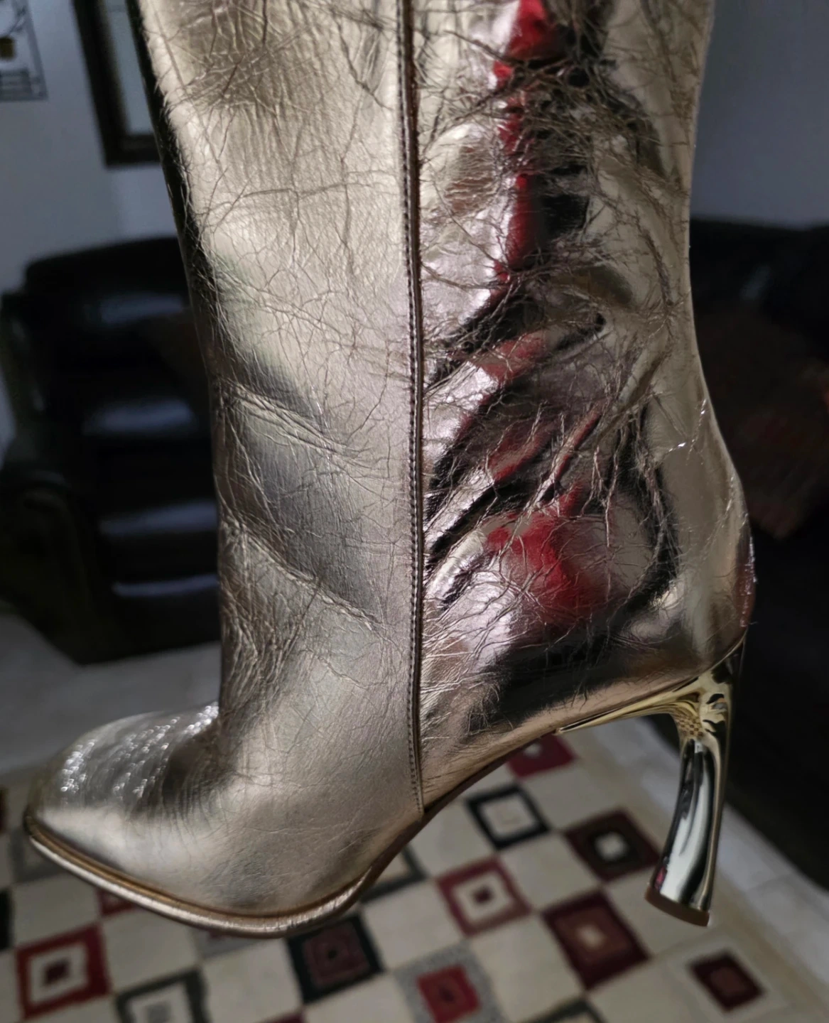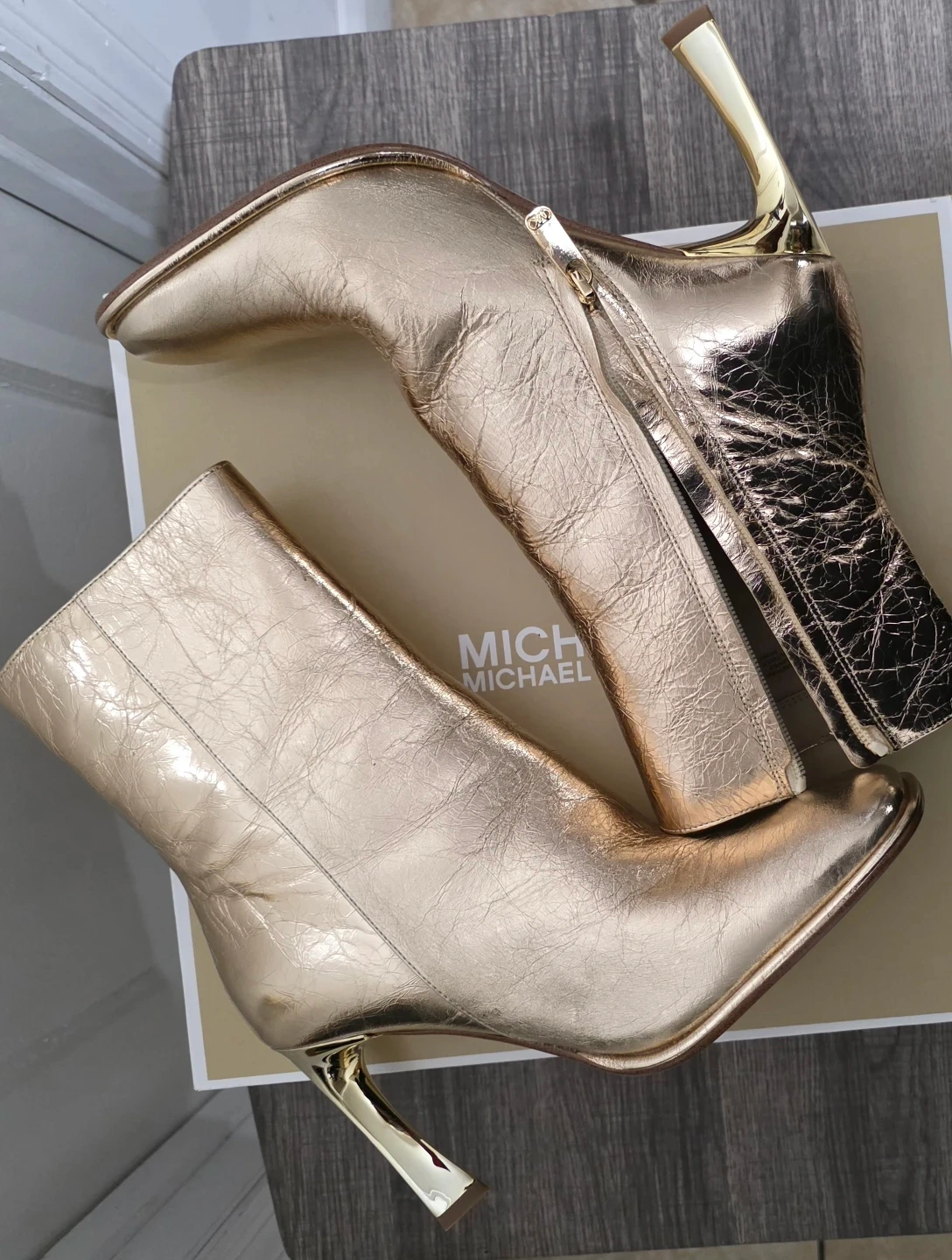Shiny gold metallic ankle boots from Michael Kors. Features a pointed toe and a unique sculpted heel. Zipper closure for easy on and off.