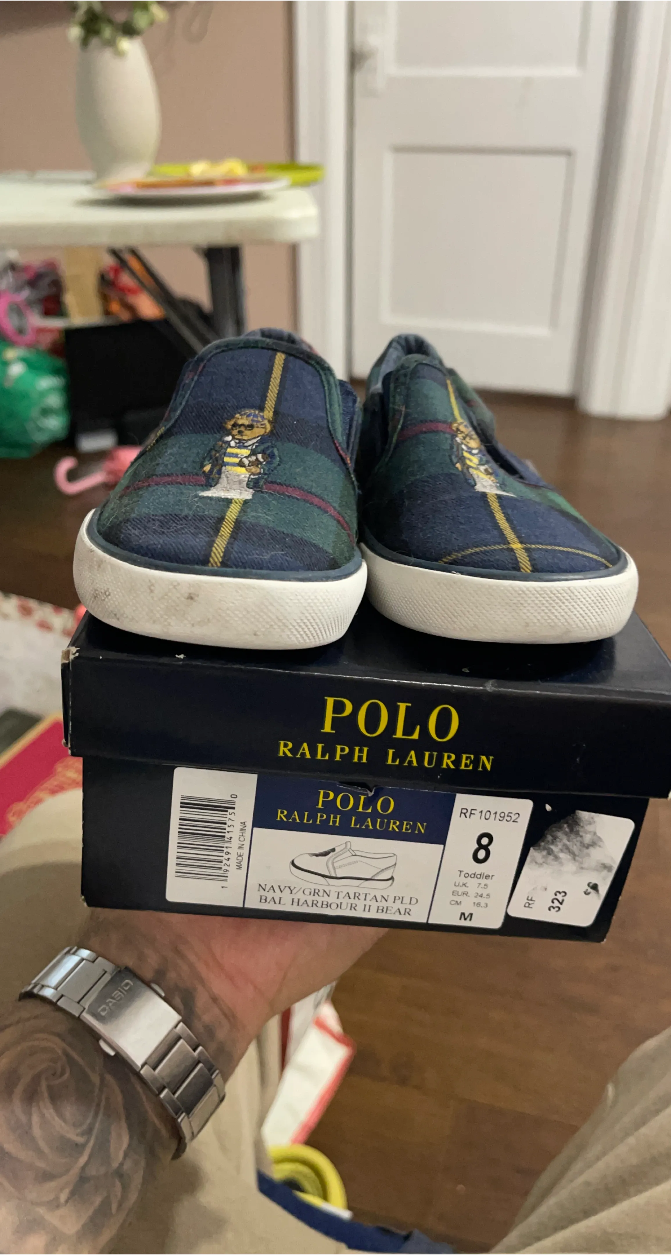These Polo Ralph Lauren slip-on shoes feature a navy and green tartan pattern with a bear graphic. Toddler size 8. Includes original box.