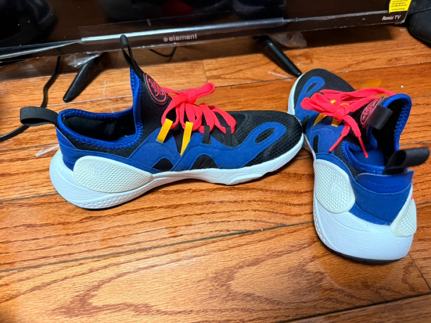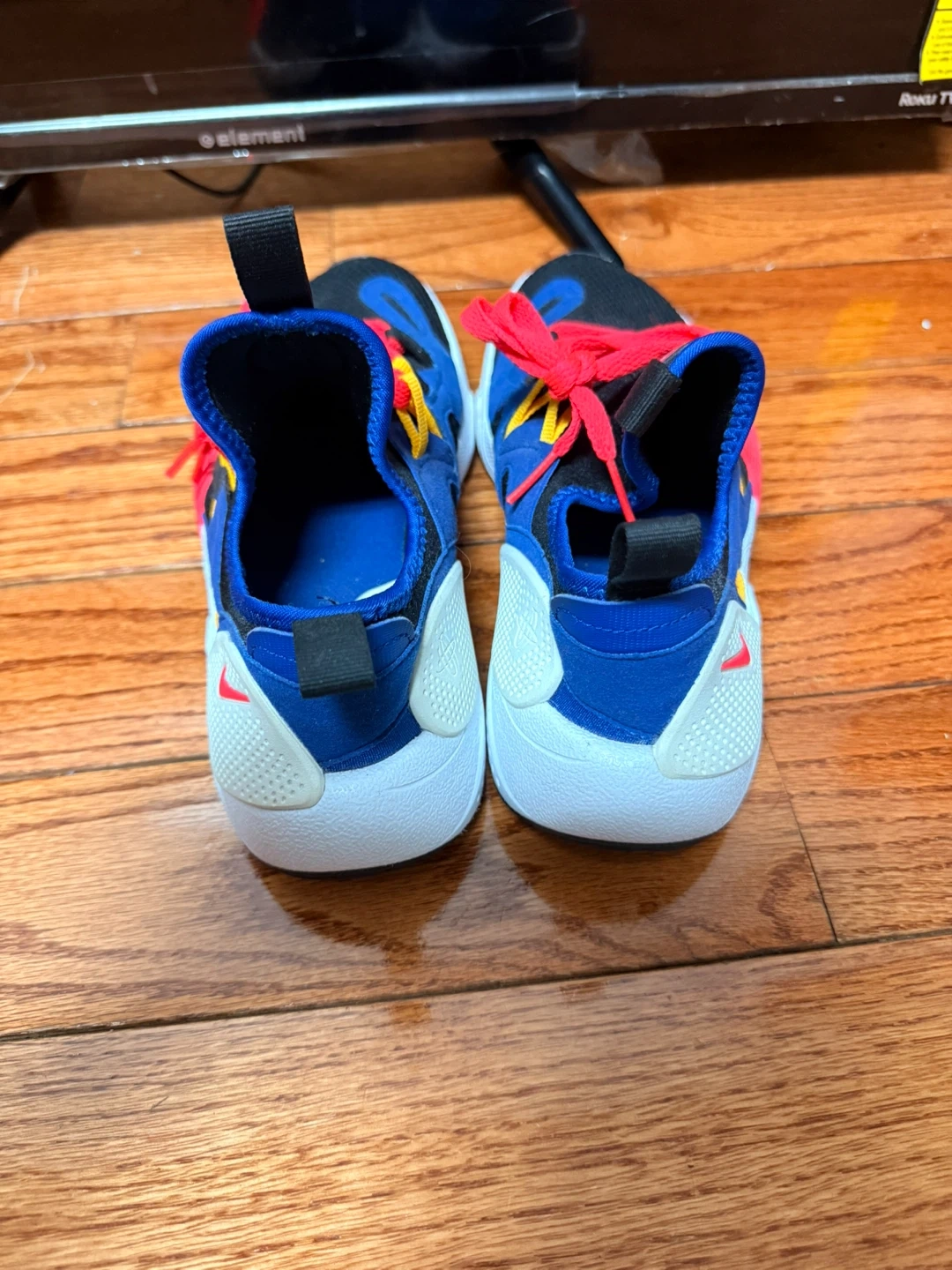 These Nike Huarache running shoes come in a blue, black, and red colorway. They're designed for comfort and performance. Featuring a dynamic lacing system and a supportive heel counter.