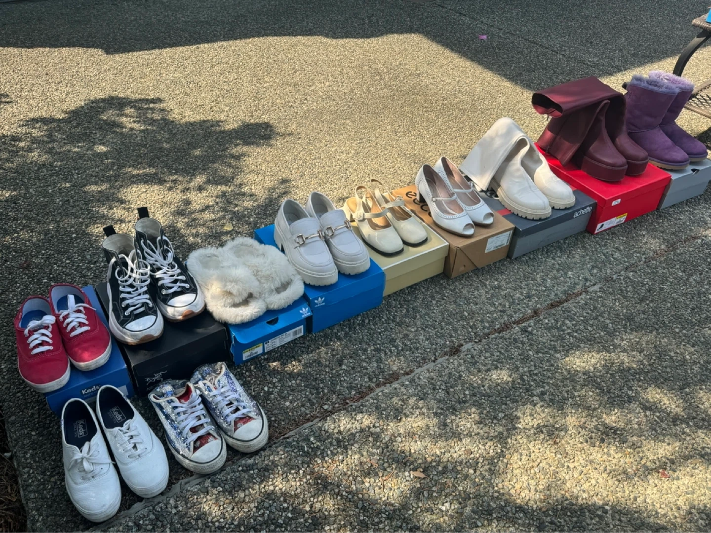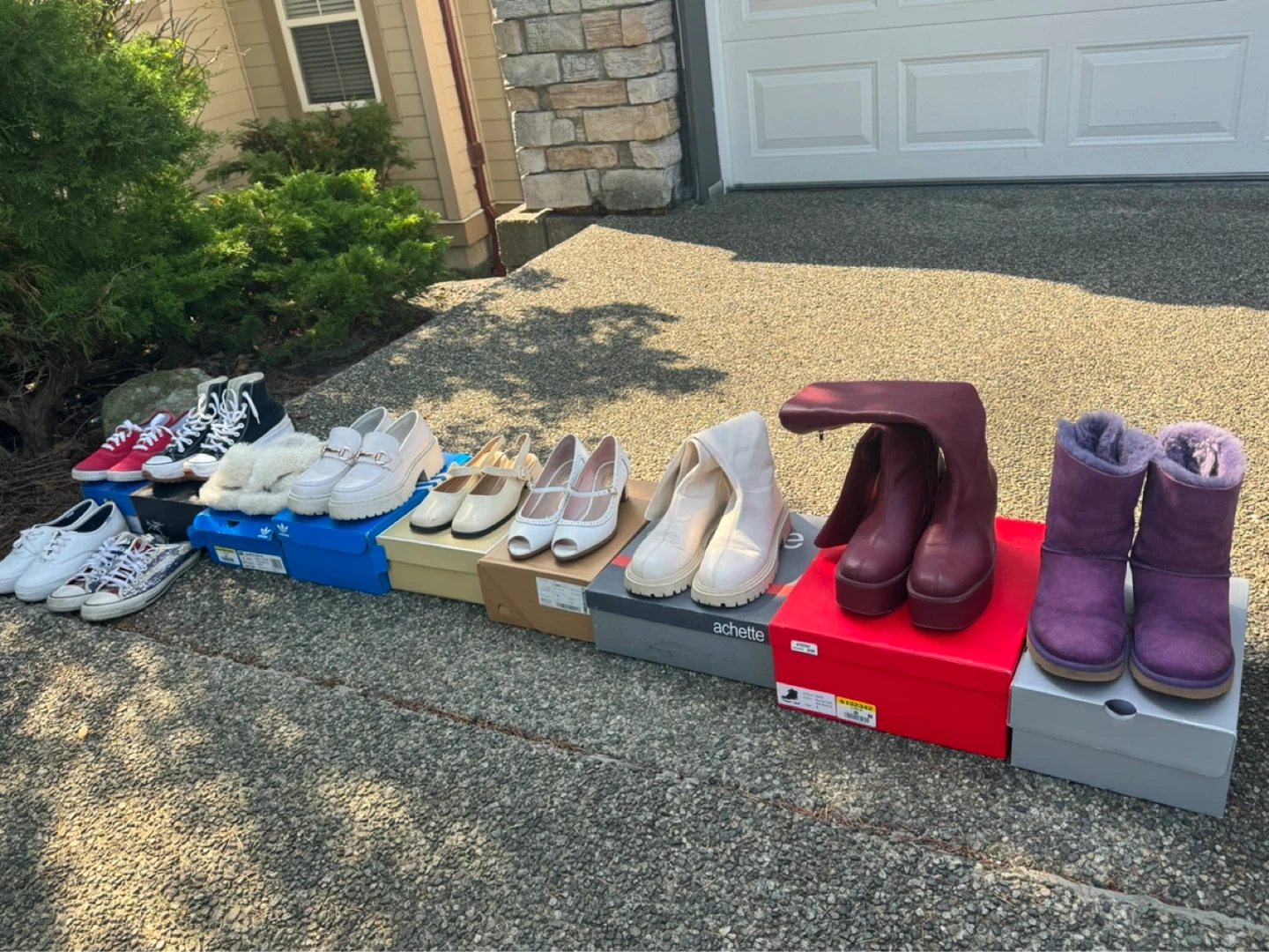 A collection of women's footwear including sneakers, boots, and heels in various styles and brands. Most pairs come with their original boxes. Offers a variety of options for different occasions. Size 7-8. Feel free to dm for more details!