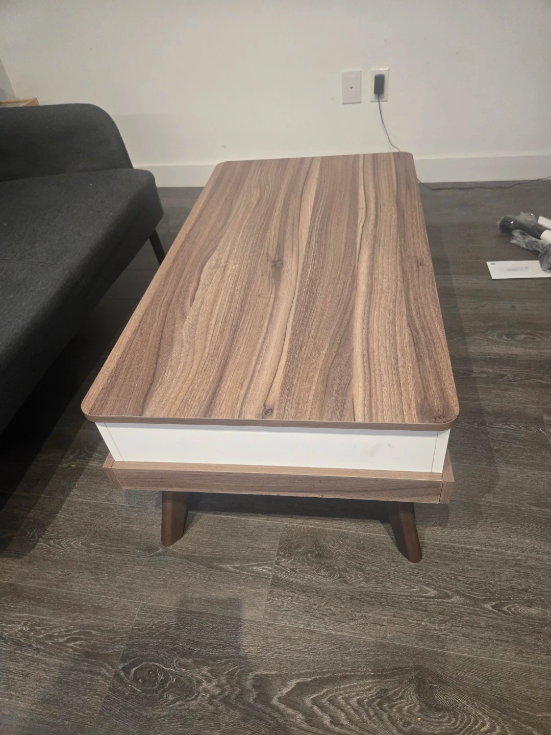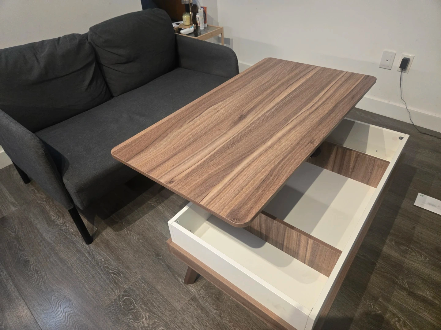 Lift top coffee table with a walnut finish and white interior storage. It features a hidden compartment for extra space. The top lifts up and forward to create a workspace or dining surface.