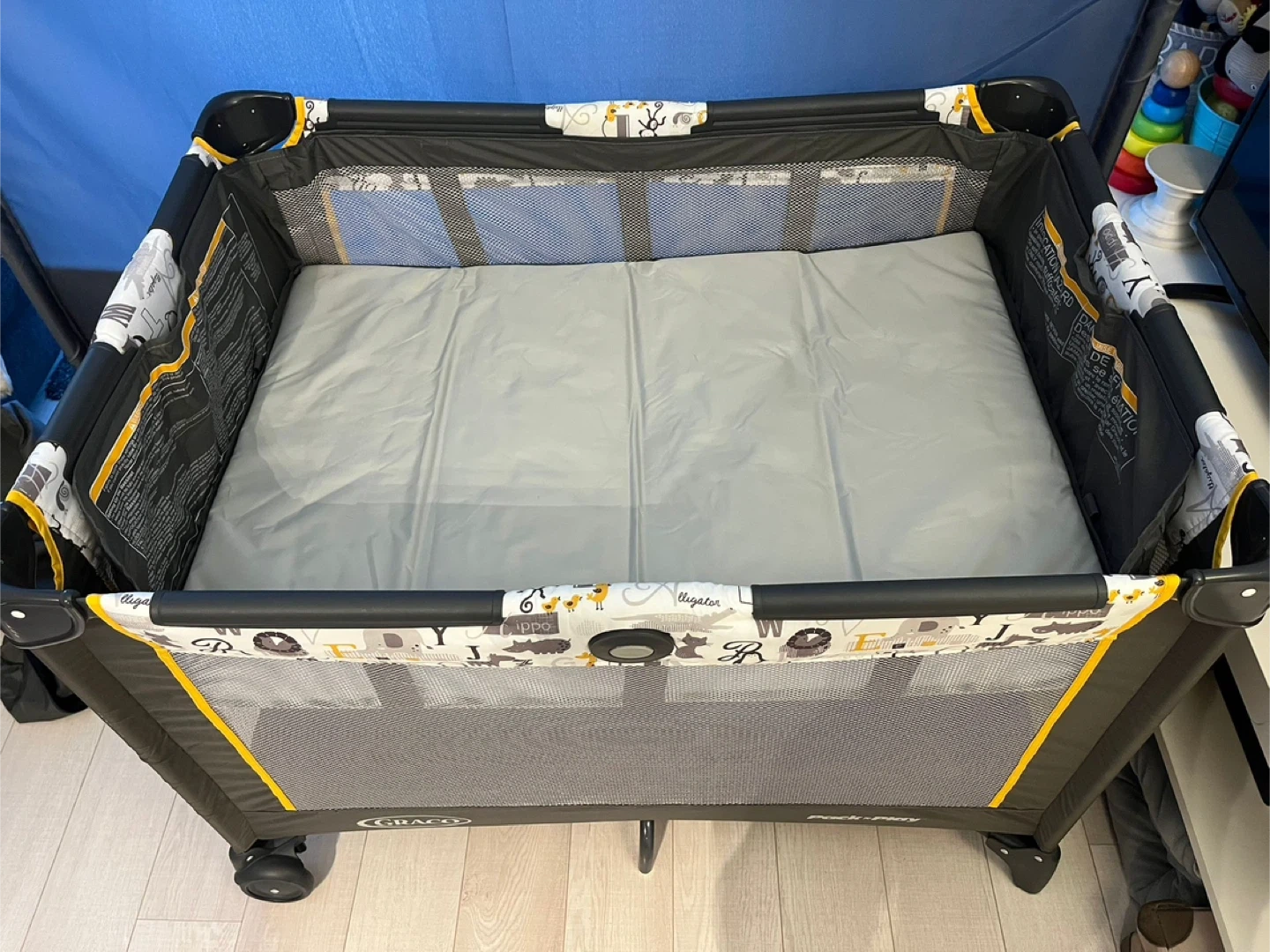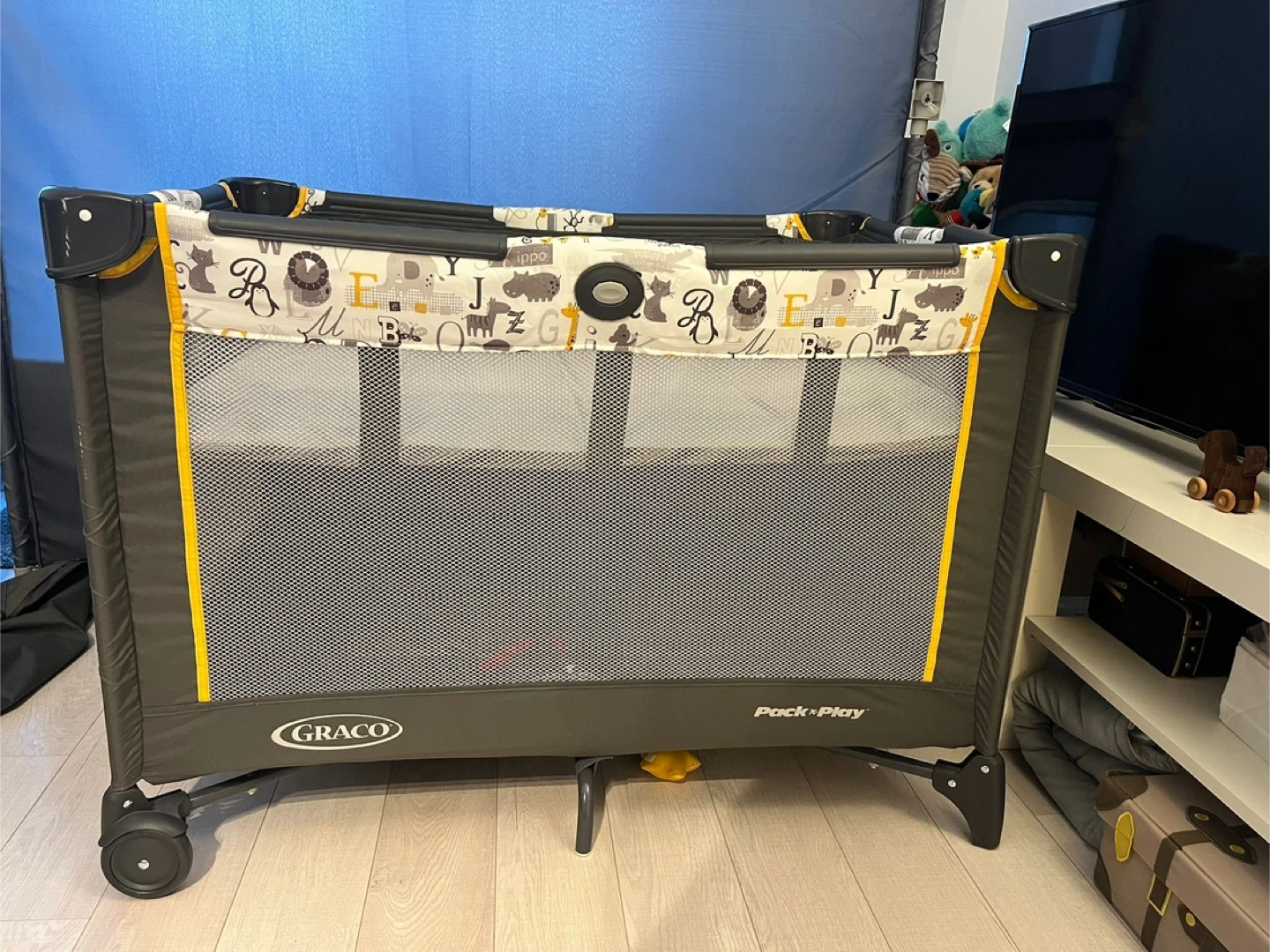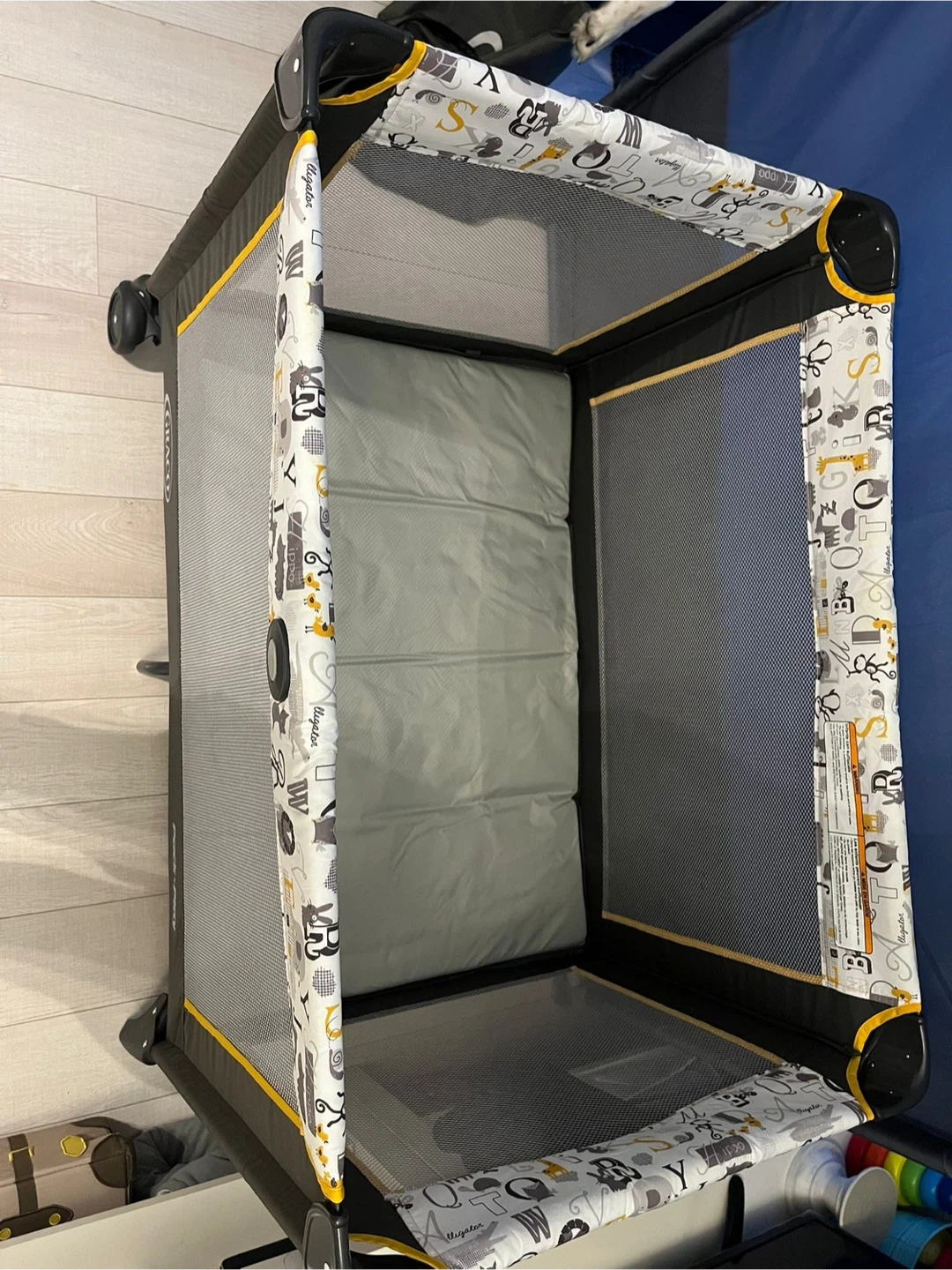 This Graco Pack 'n Play playard is great for travel or home use. It's designed with a fun alphabet and animal print on the canopy. It includes a carry bag for easy transport and storage.