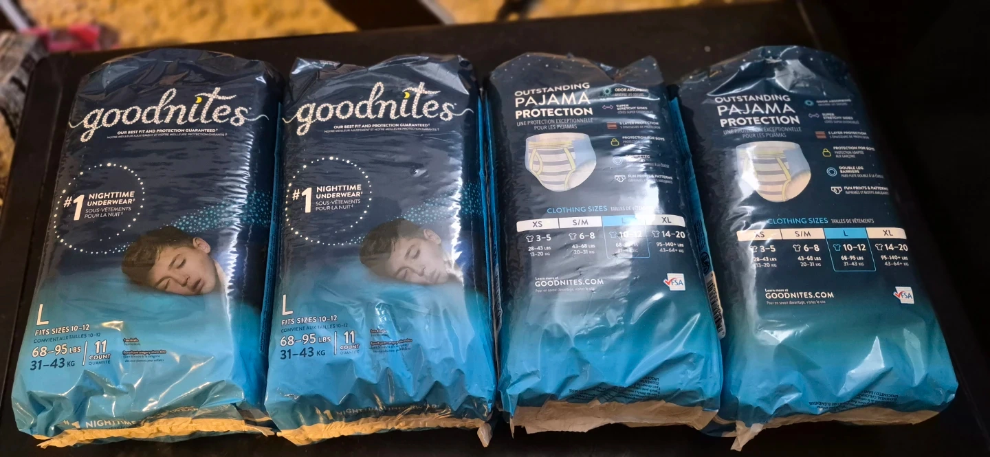 nighttime underwear. Fits sizes 10-12, suitable for 68-95 lbs or 31-43 kg. Each package contains 11 counts. Outstanding pajama protection for nighttime dryness.