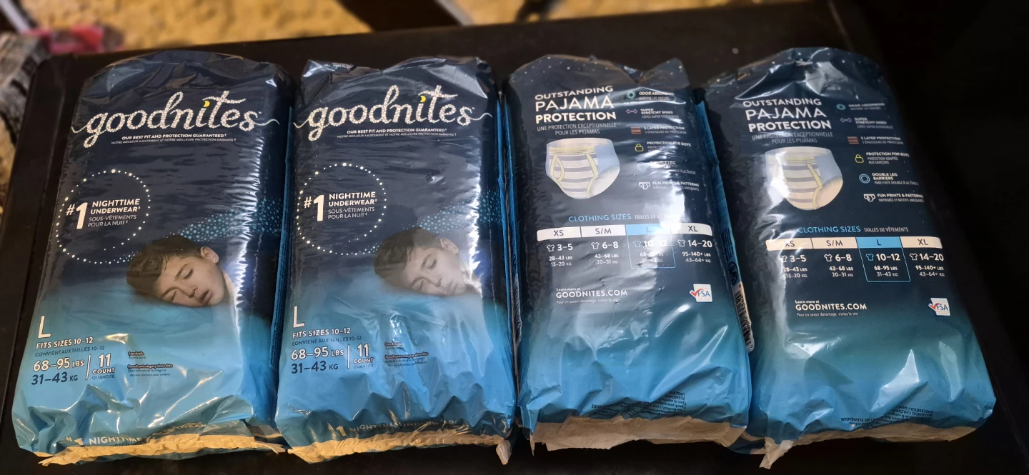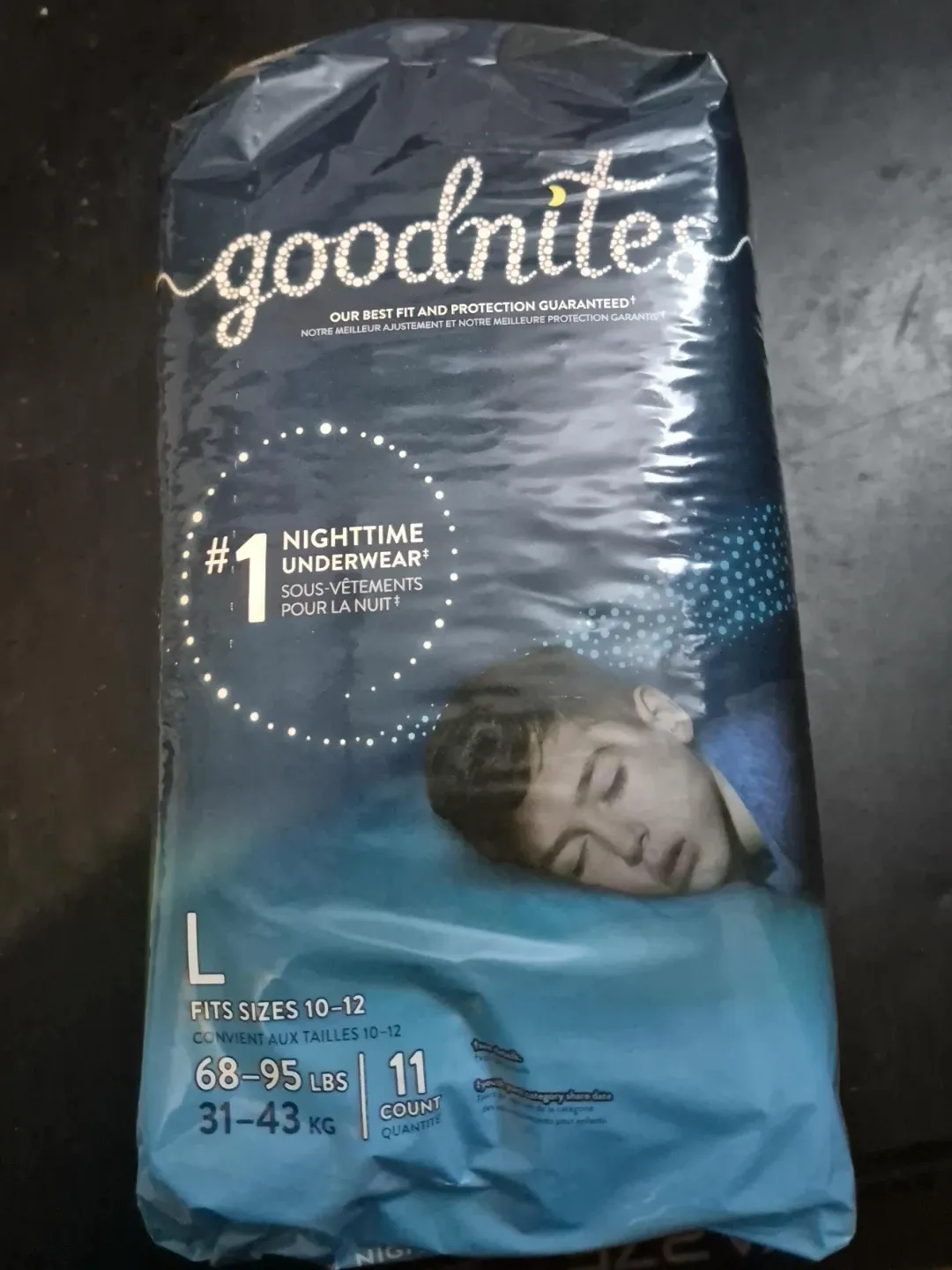 nighttime underwear. Fits sizes 10-12, suitable for 68-95 lbs or 31-43 kg. Each package contains 11 counts. Outstanding pajama protection for nighttime dryness.