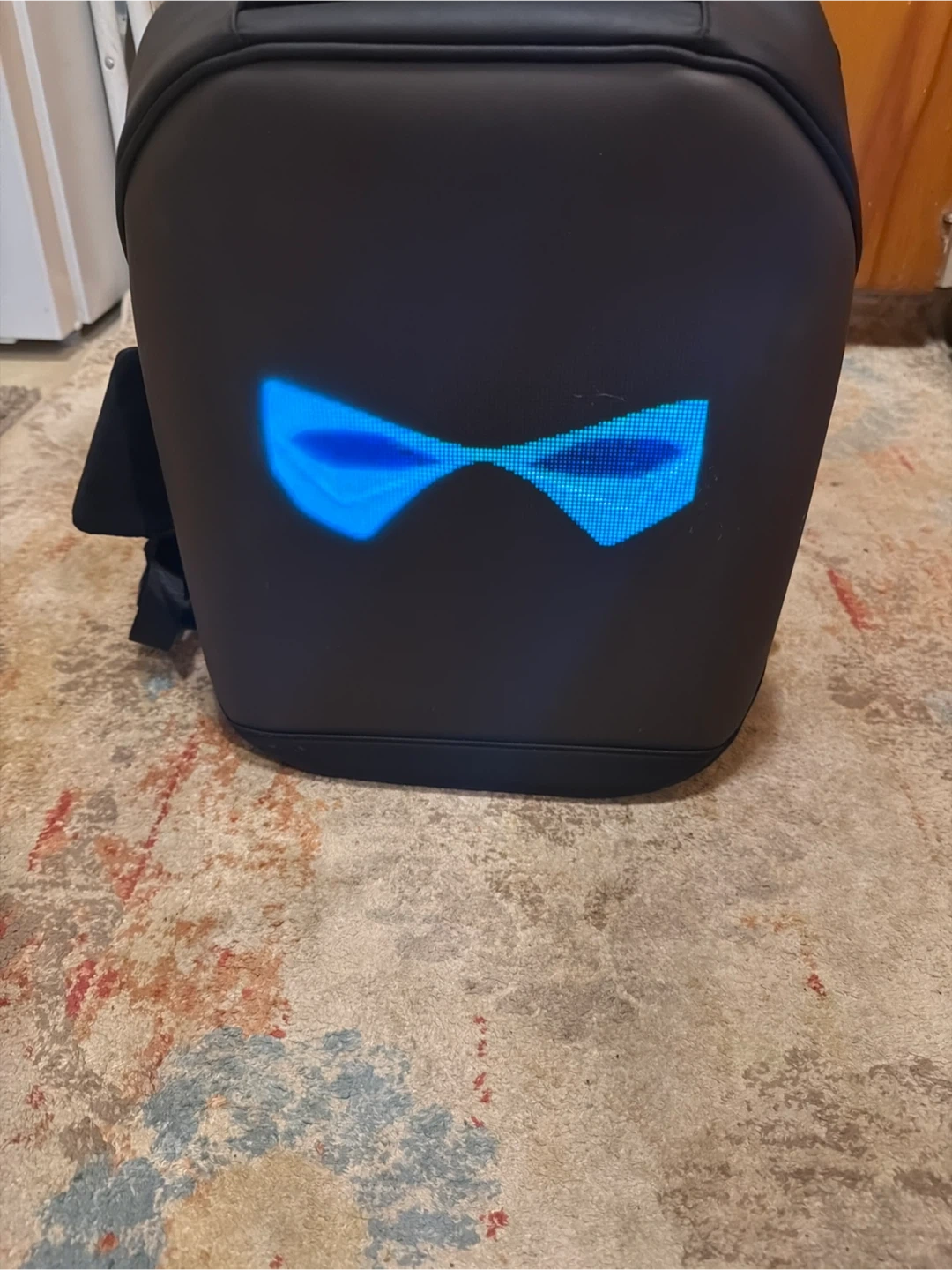 This is a black backpack featuring a programmable LED display on the front. You can show custom pixel art and animations. It's a great way to express yourself or stand out! It has a durable exterior and comfortable straps.