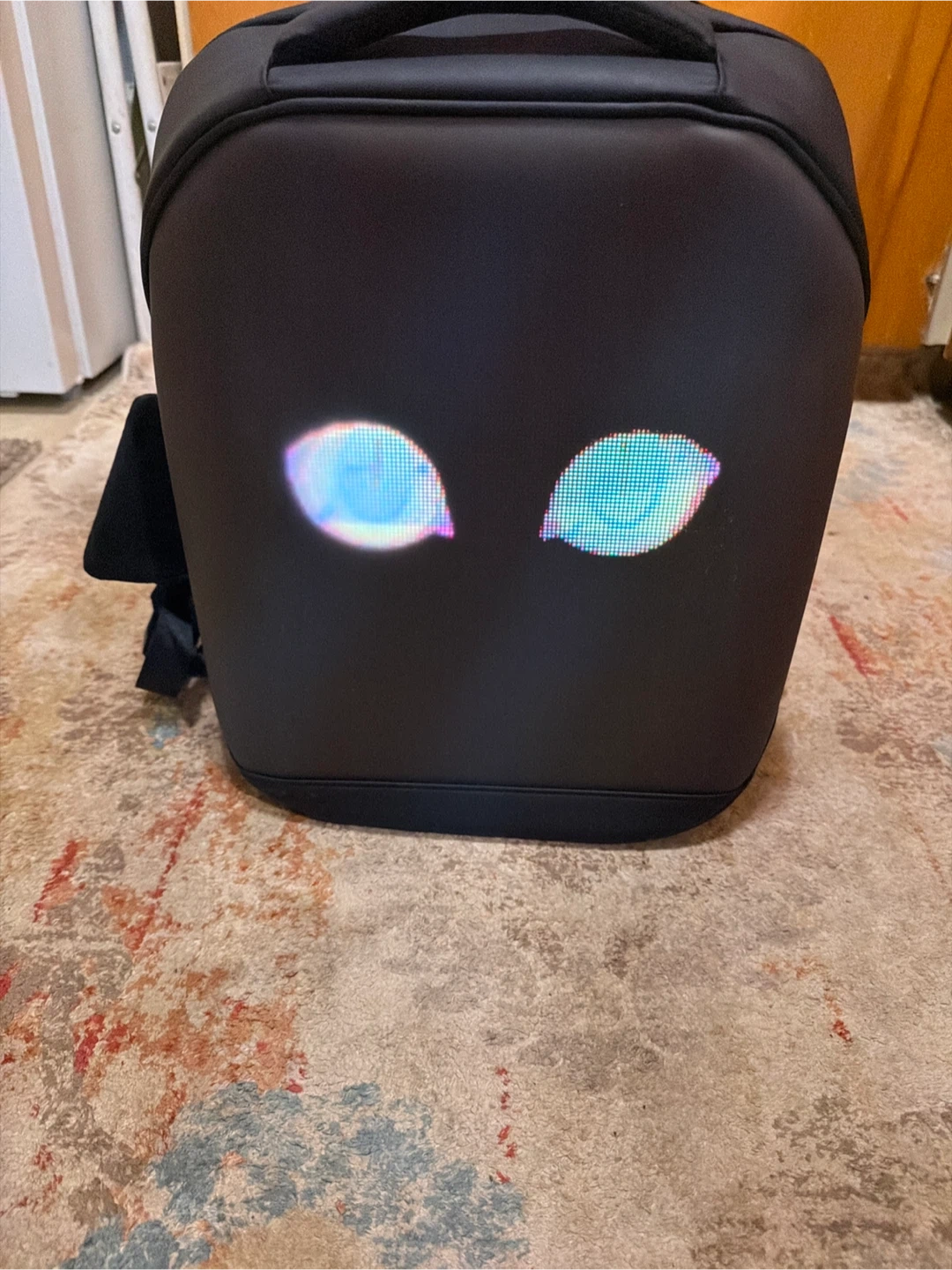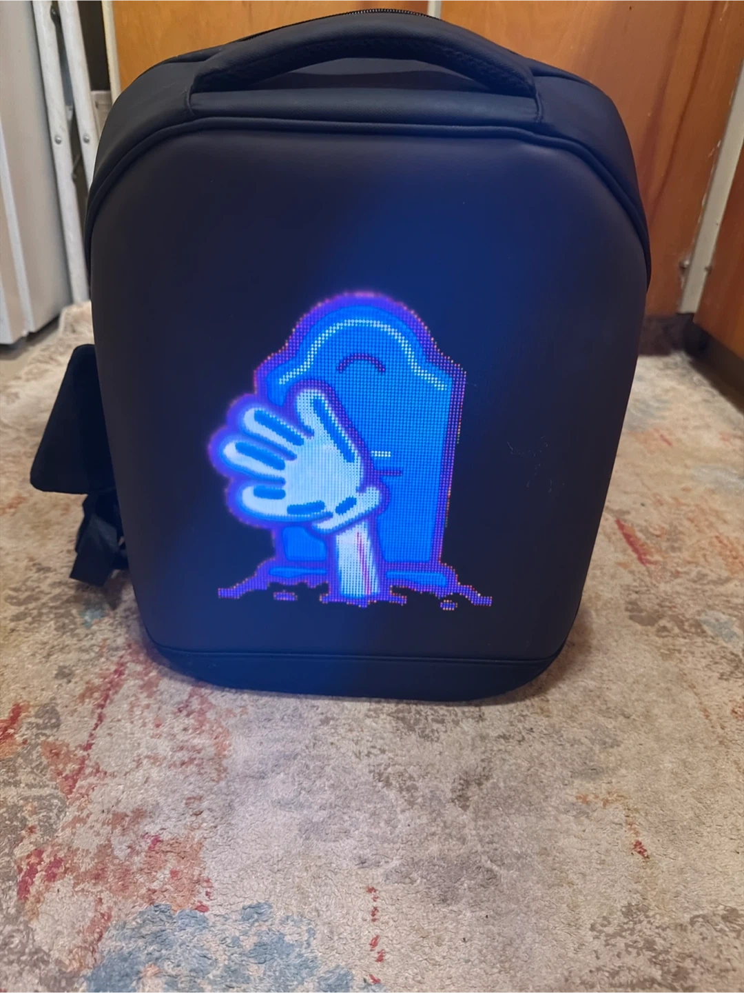 This is a black backpack featuring a programmable LED display on the front. You can show custom pixel art and animations. It's a great way to express yourself or stand out! It has a durable exterior and comfortable straps.