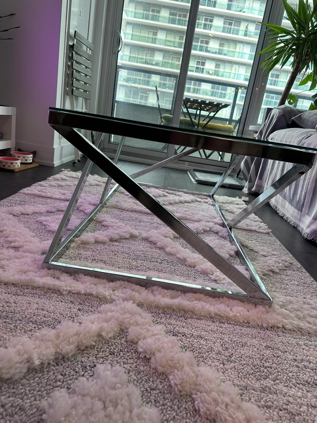 A modern coffee table with a sleek glass top and a geometric chrome metal frame. It's a stylish piece for any living room. The spacious surface is great for holding drinks and decor.