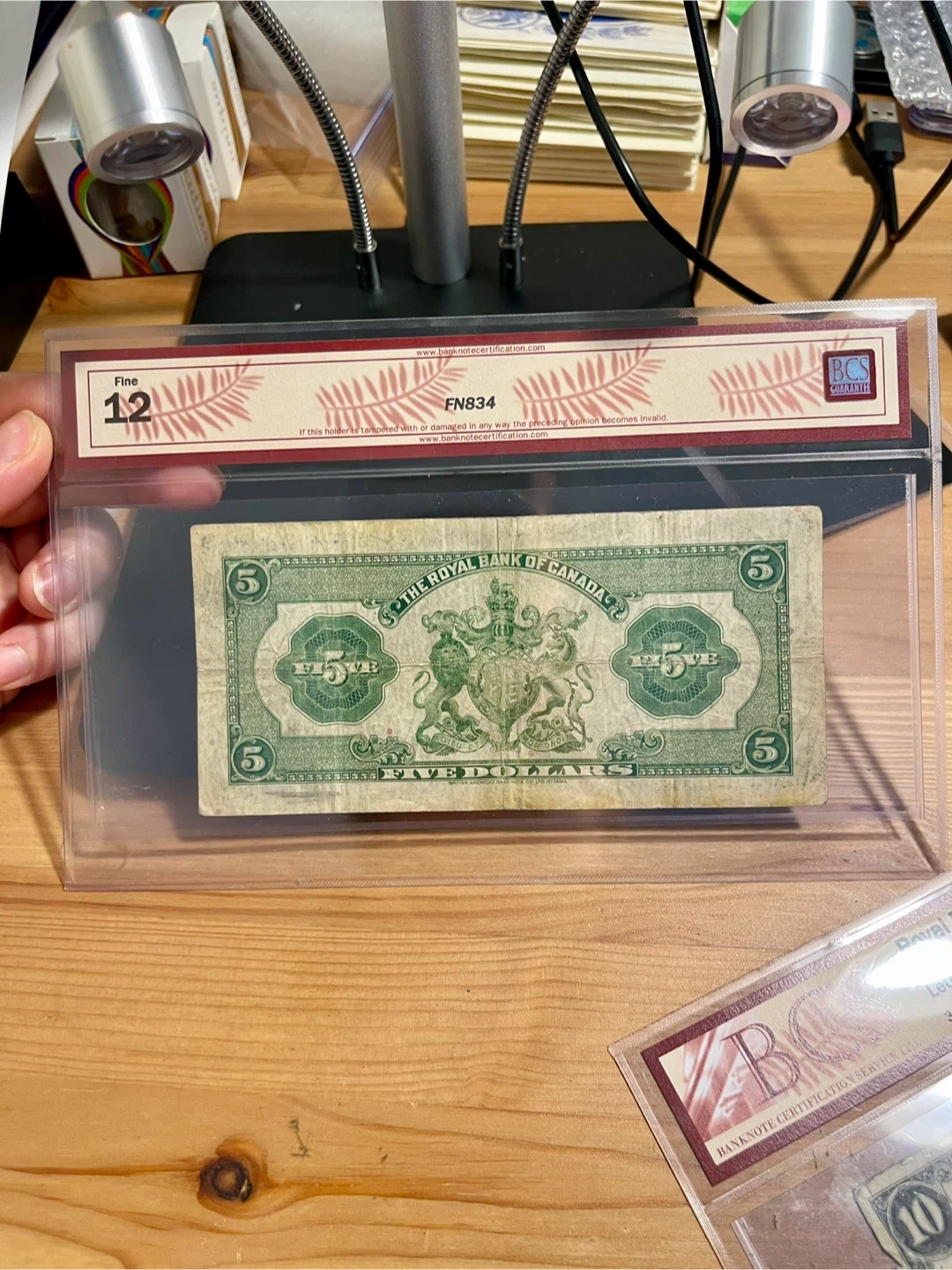 This is a 1935 five-dollar banknote from The Royal Bank of Canada. It's from the Dobson-Wilson series with large signatures and a check letter B. The note has a grade of Fine 12 with comments indicating a tear.
