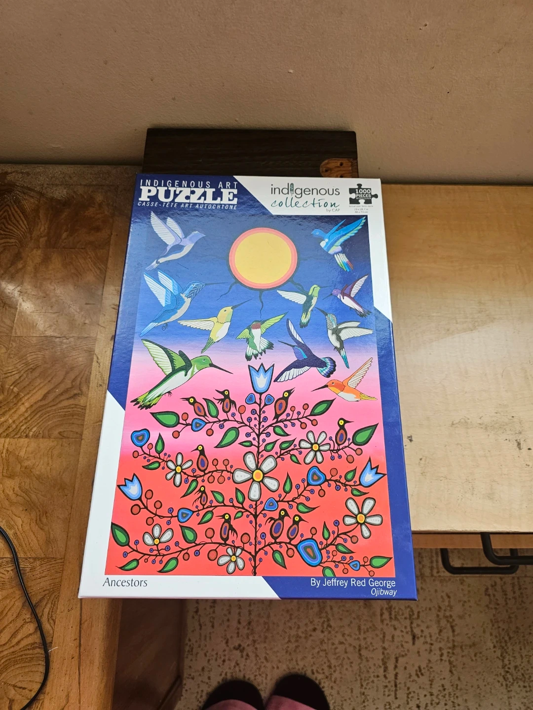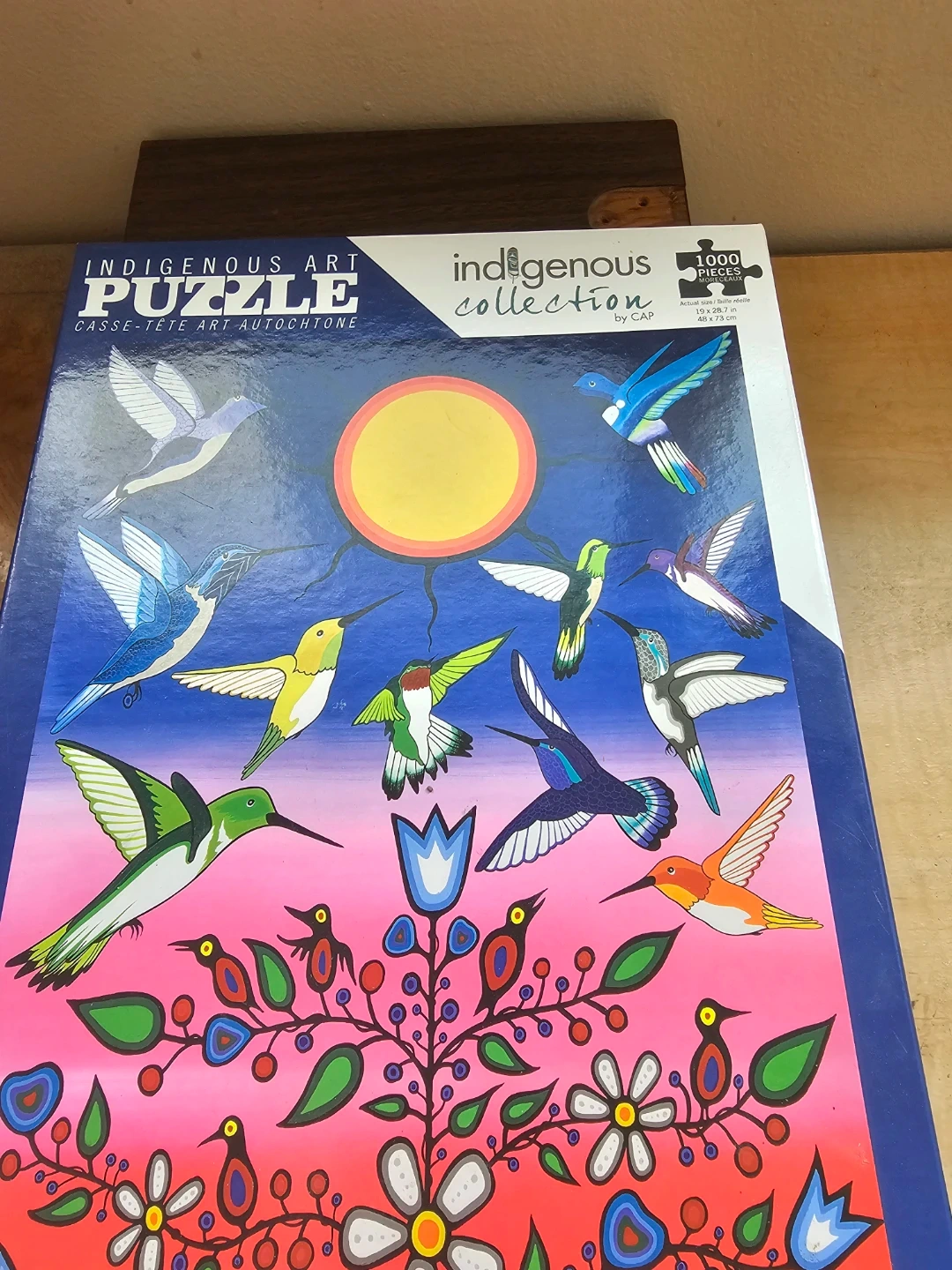 This 1000-piece puzzle features Indigenous art titled 'Ancestors' by Jeffrey Red George Ojibway. It's part of the Indigenous Collection and showcases a vibrant scene with hummingbirds and floral motifs. The completed puzzle measures 19" x 27" (48 x 70 cm).
