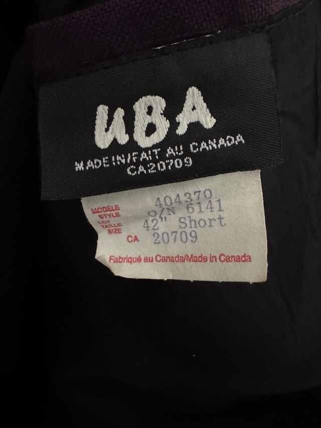 Size 42S, Men’s Made in Canada and it is in excellent condition. We kept it neatly in storage and protected inside a blazer plastic cover until recently. Elevate your style with this sophisticated purple blazer. Perfect for formal occasions or adding a touch of elegance to your everyday look. This eye-catching men's purple blazer, size 42 short, is proudly made in Canada by UBA. While it has been previously enjoyed, it still has plenty of style to offer for someone looking to add a pop of colour to your wardrobe. Here are some additional details:
