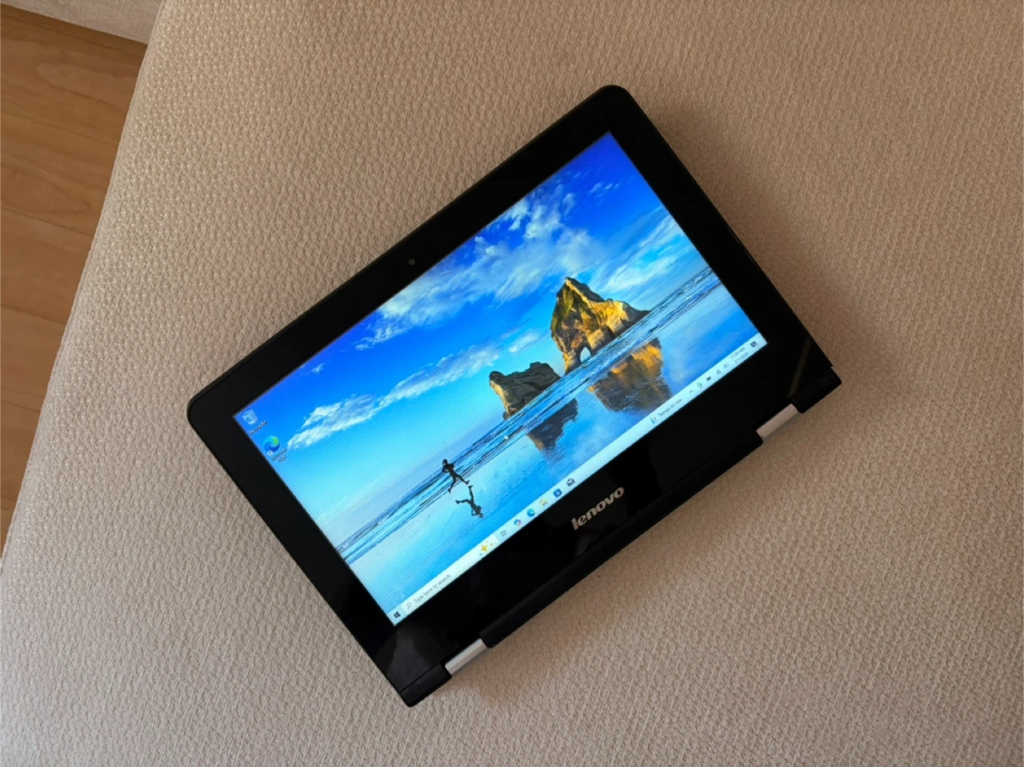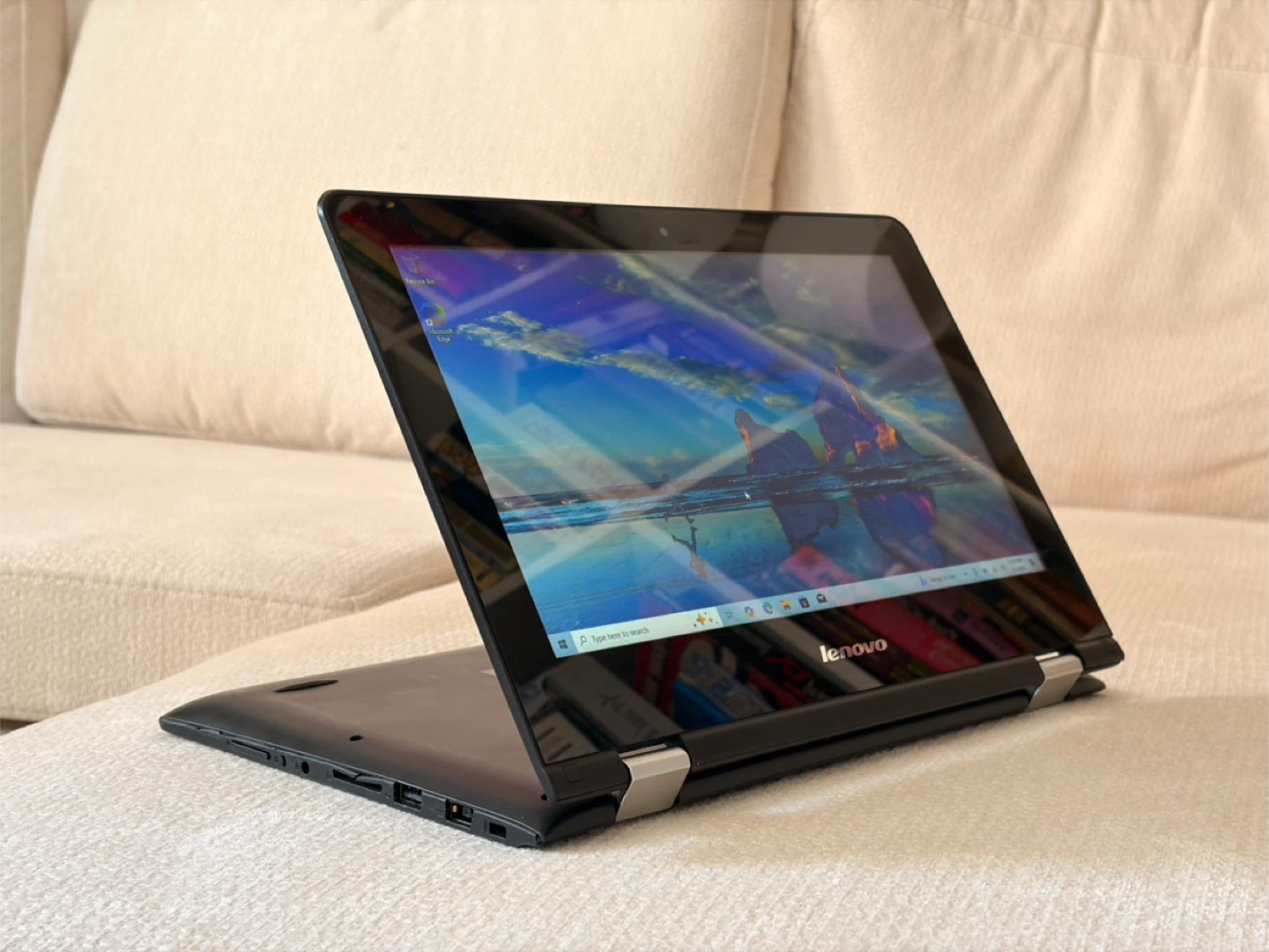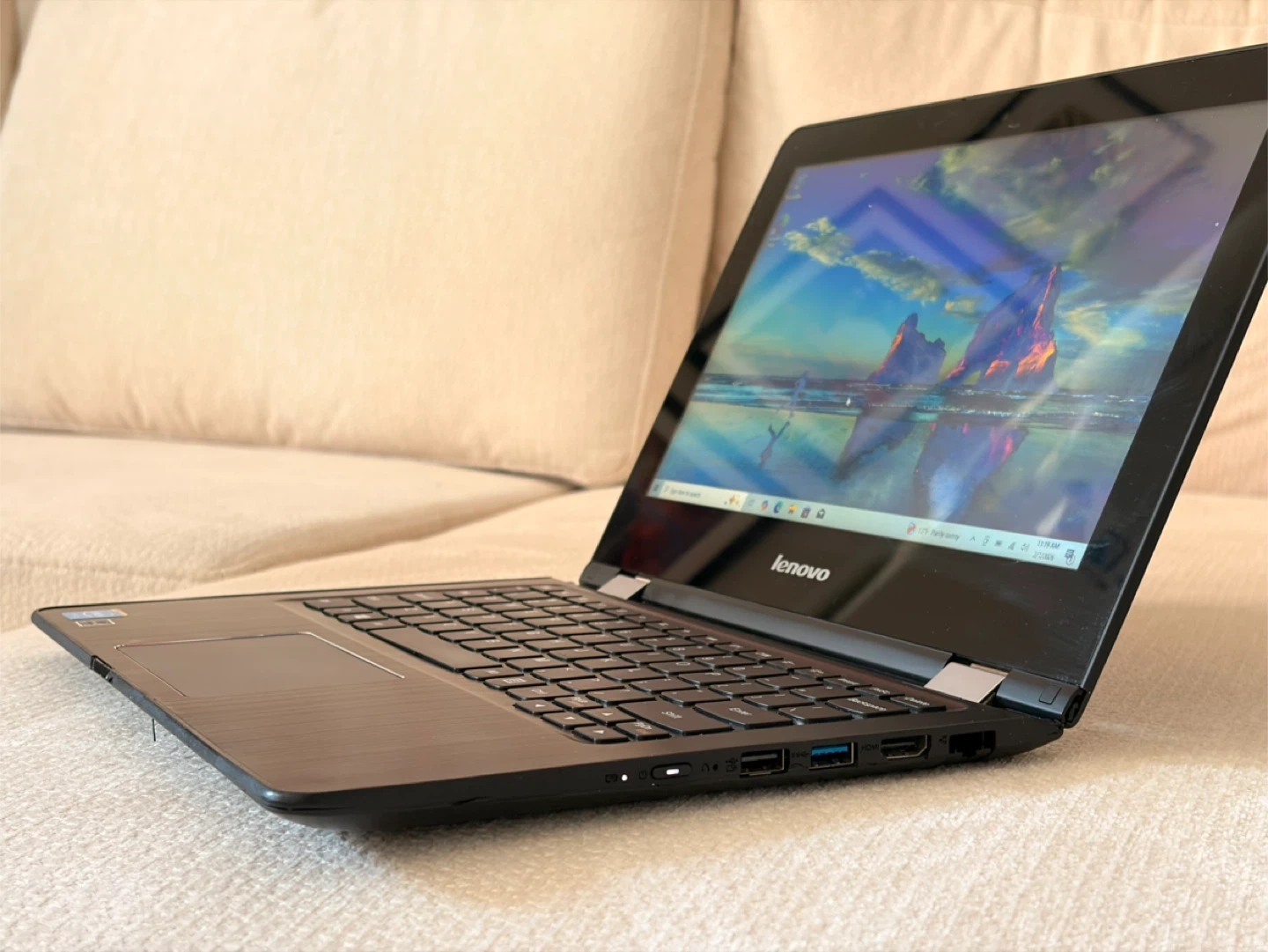 This is a Lenovo laptop. It has a black finish and a standard keyboard layout. It's a versatile device suitable for everyday computing tasks. You can use it like laptop and tablet. Perfect for office tasks, remote work, school, and media. • Intel Celeron N3060 (up to 2.5Ghz, 2 Cores) • 4GB RAM / 500GB Storage • 11.6” LED Touchscreen Charger included Battery life: about 3-4h