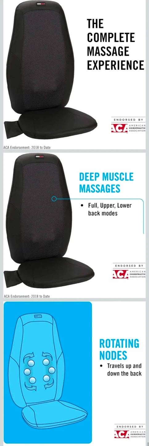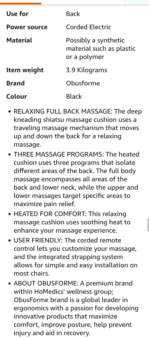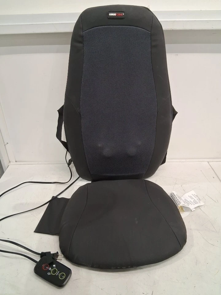 This is an ObusForme Deep Kneading Shiatsu Back Massager. It has three massage zones, for the upper, lower or full back. It is designed as a massage cushion for use with a chair.