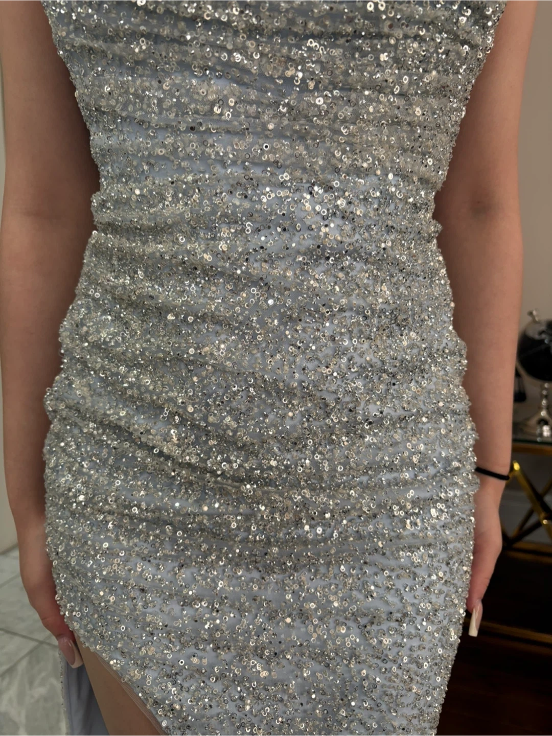 Sparkly sequin strapless gown with a high slit. It features intricate all-over sequin embellishments and a fit. Perfect for a formal event or a night out!