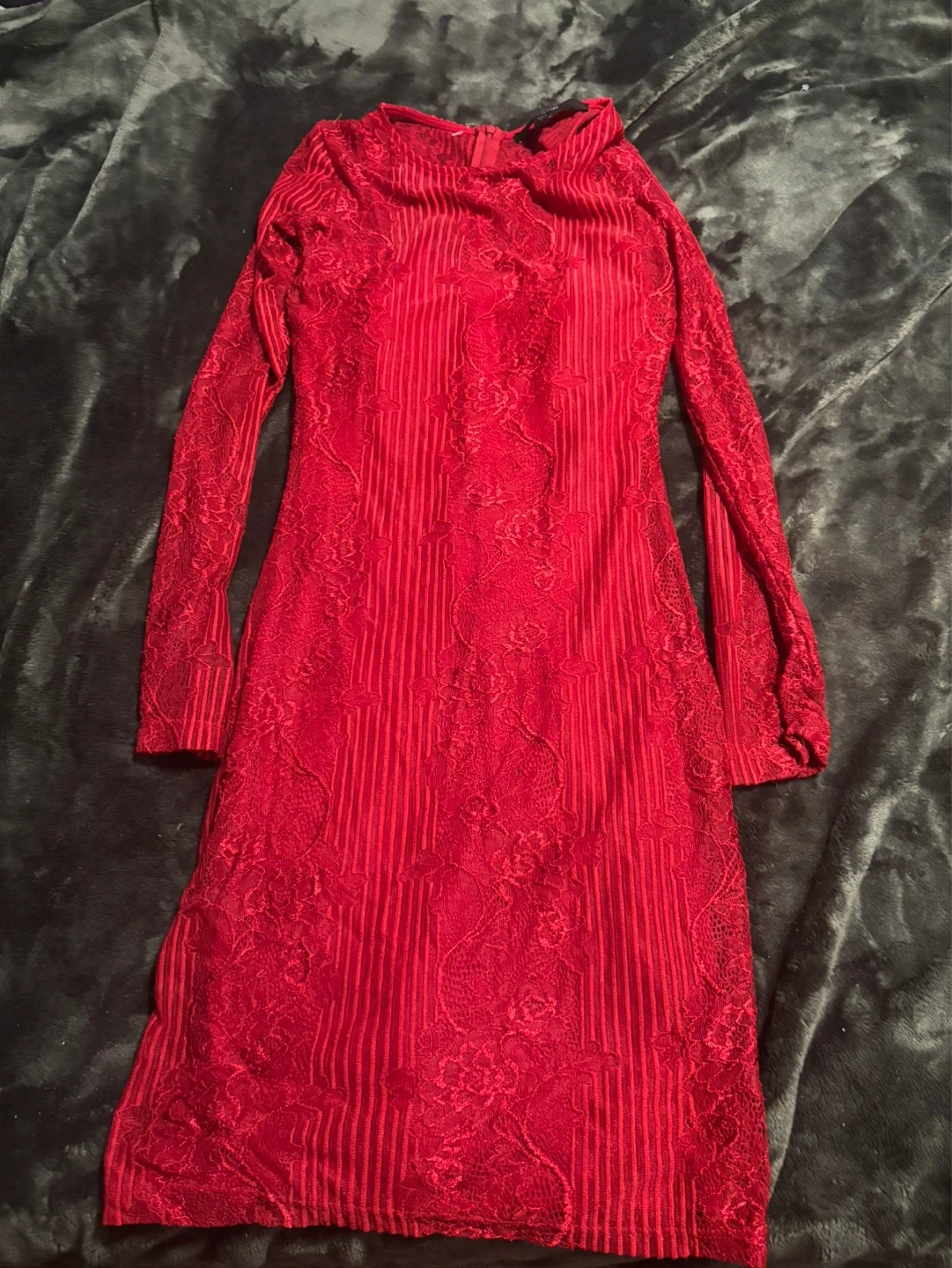 This is a GUESS red lace dress in size small. It features a high neckline and long sleeves. Perfect for a night out!