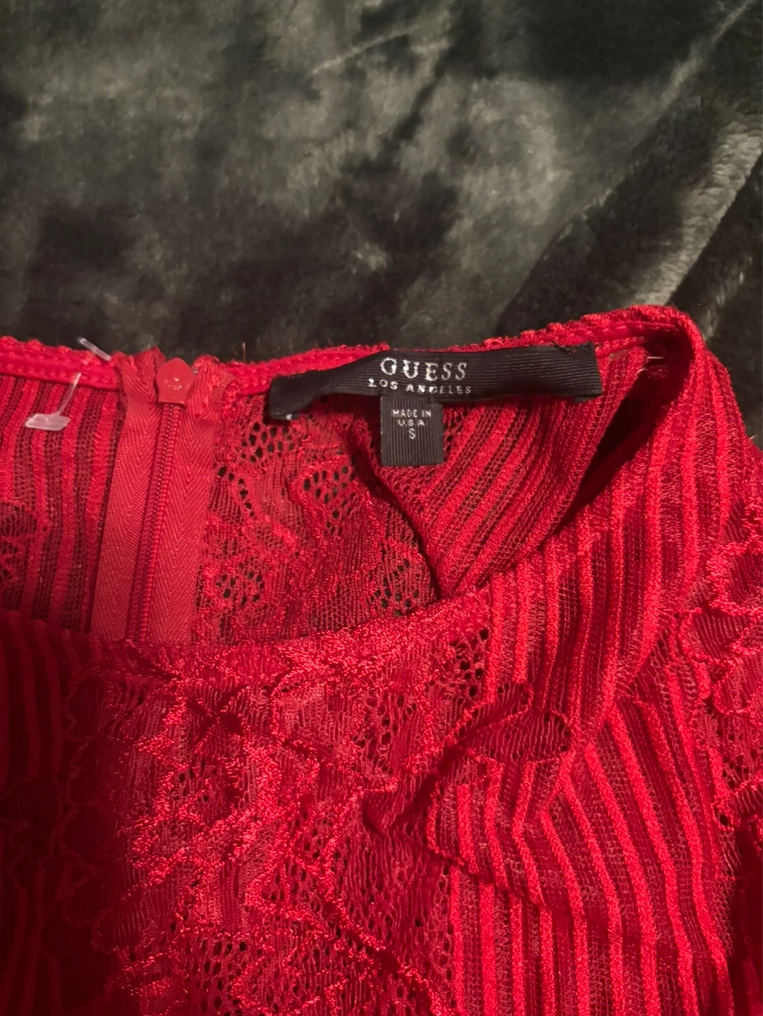 This is a GUESS red lace dress in size small. It features a high neckline and long sleeves. Perfect for a night out!