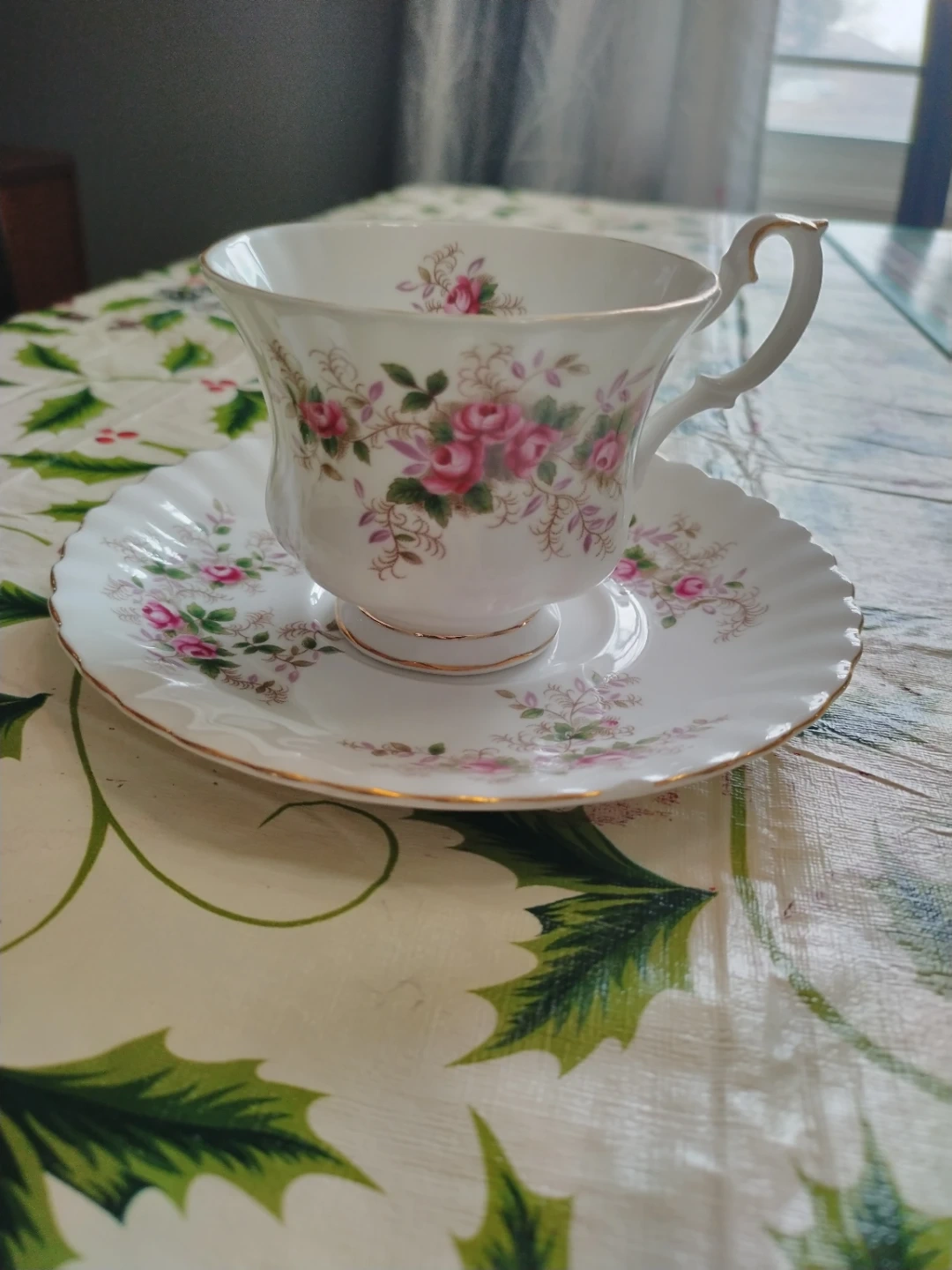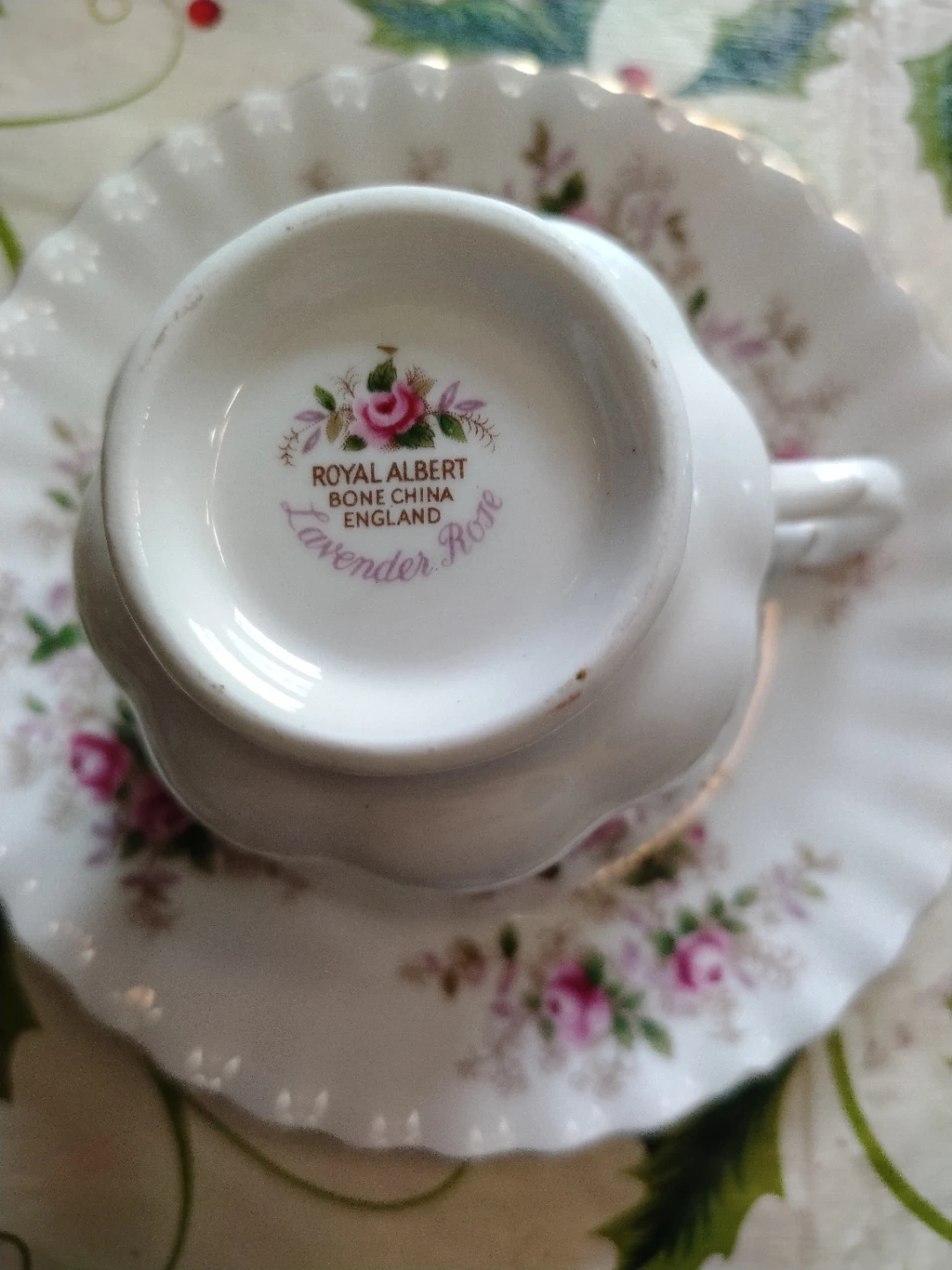 Elegant Royal Albert teacup and saucer in the Lavender Rose pattern. Bone china craftsmanship from England. Beautiful floral design with a gold-rimmed edge. Perfect for enjoying a lovely cup of tea!
