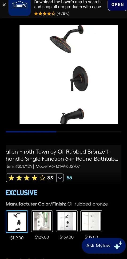 Shower faucet set. Oil-rubbed bronze finish. Includes shower head, faucet, and handles. Ceramic disc cartridge. A nice warm shower is always a great way to end a long day.