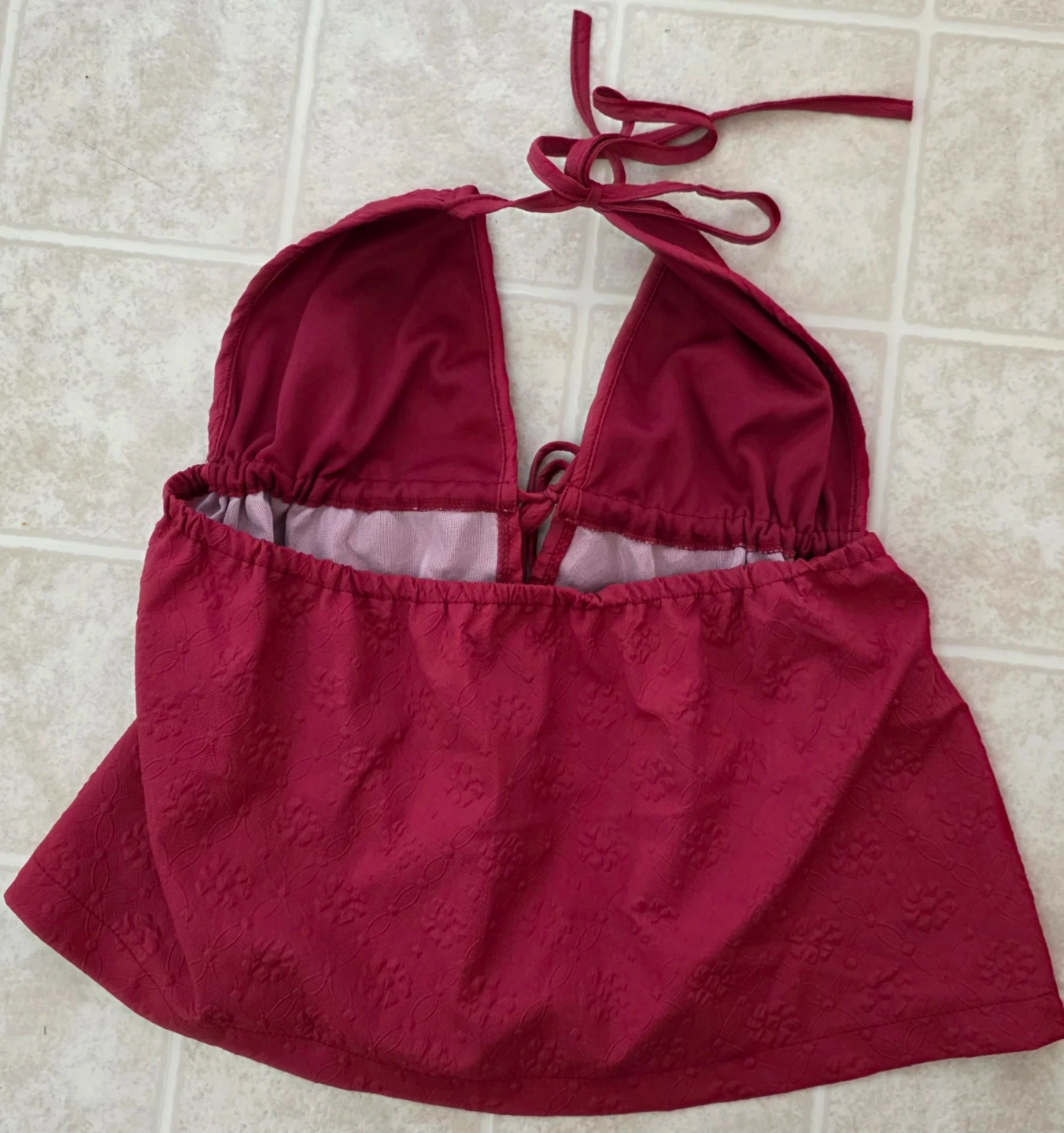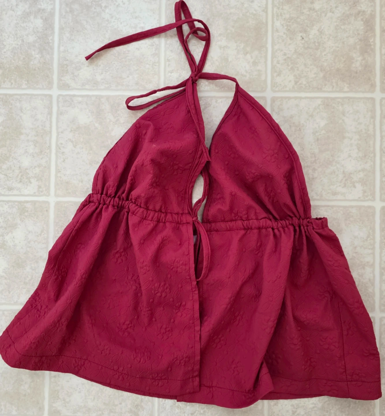 Get ready for sunny days with this super cute burgundy halter top! It features a beautiful subtle floral texture embossed into the fabric and a super flattering cut. It ties at the neck and back, making it adjustable for the perfect fit.