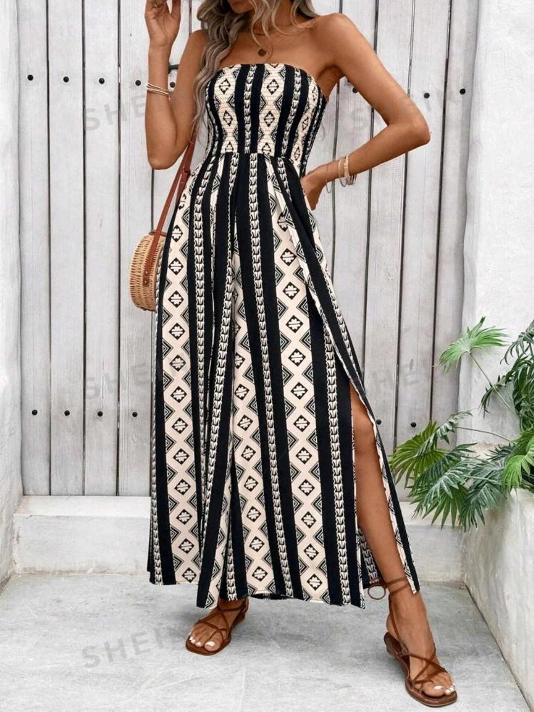 Brand New. Stunning strapless maxi jumpsuit. Features a beautiful black and cream patterned print. Elastic waistband. Side slits. Perfect for a summer event.