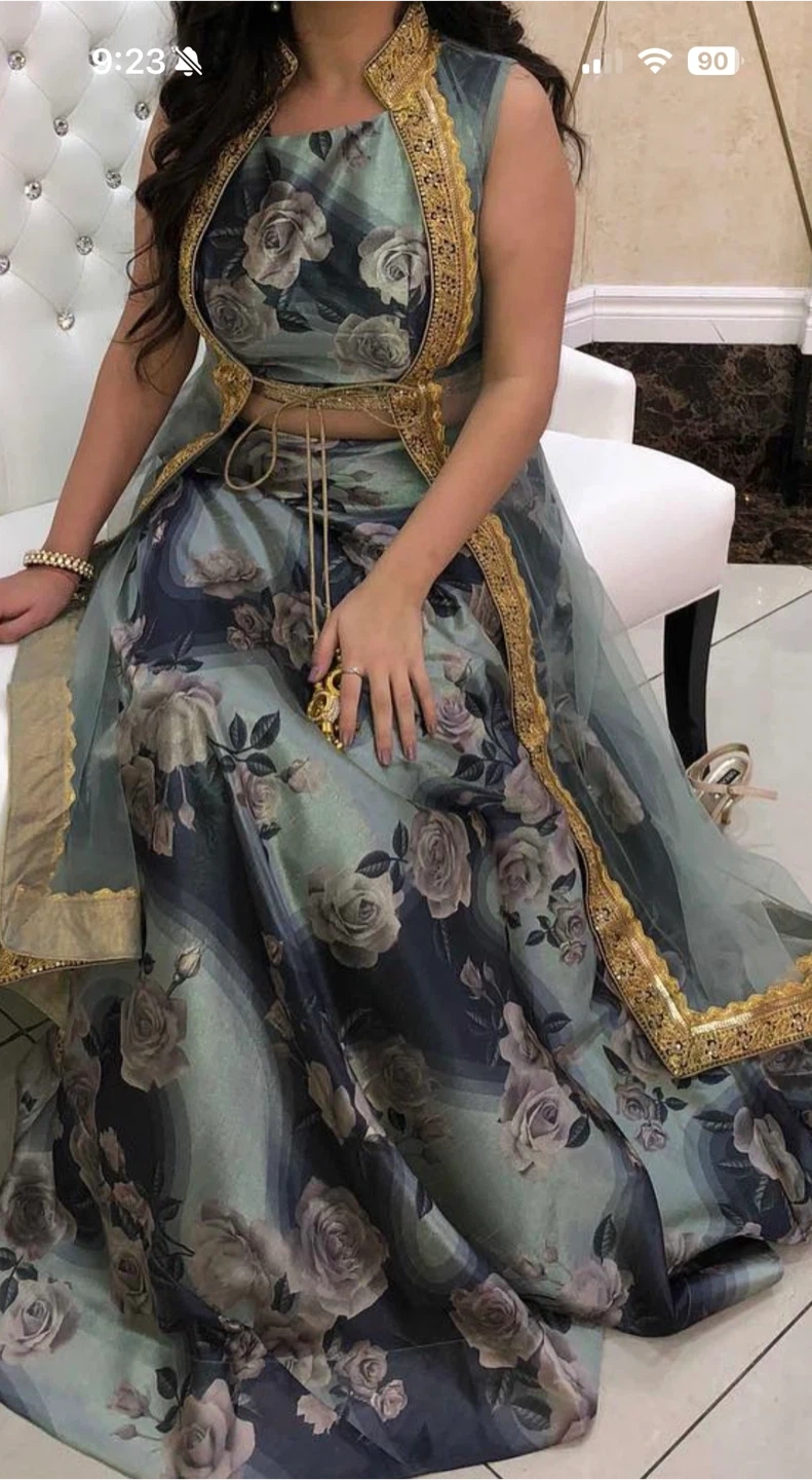 This elegant three-piece outfit features a printed lehenga and crop top, paired with a sheer, sleeveless jacket. The jacket is adorned with intricate gold trim along the neckline and hem. The set showcases a beautiful floral motif in shades of grey, teal, and navy.
