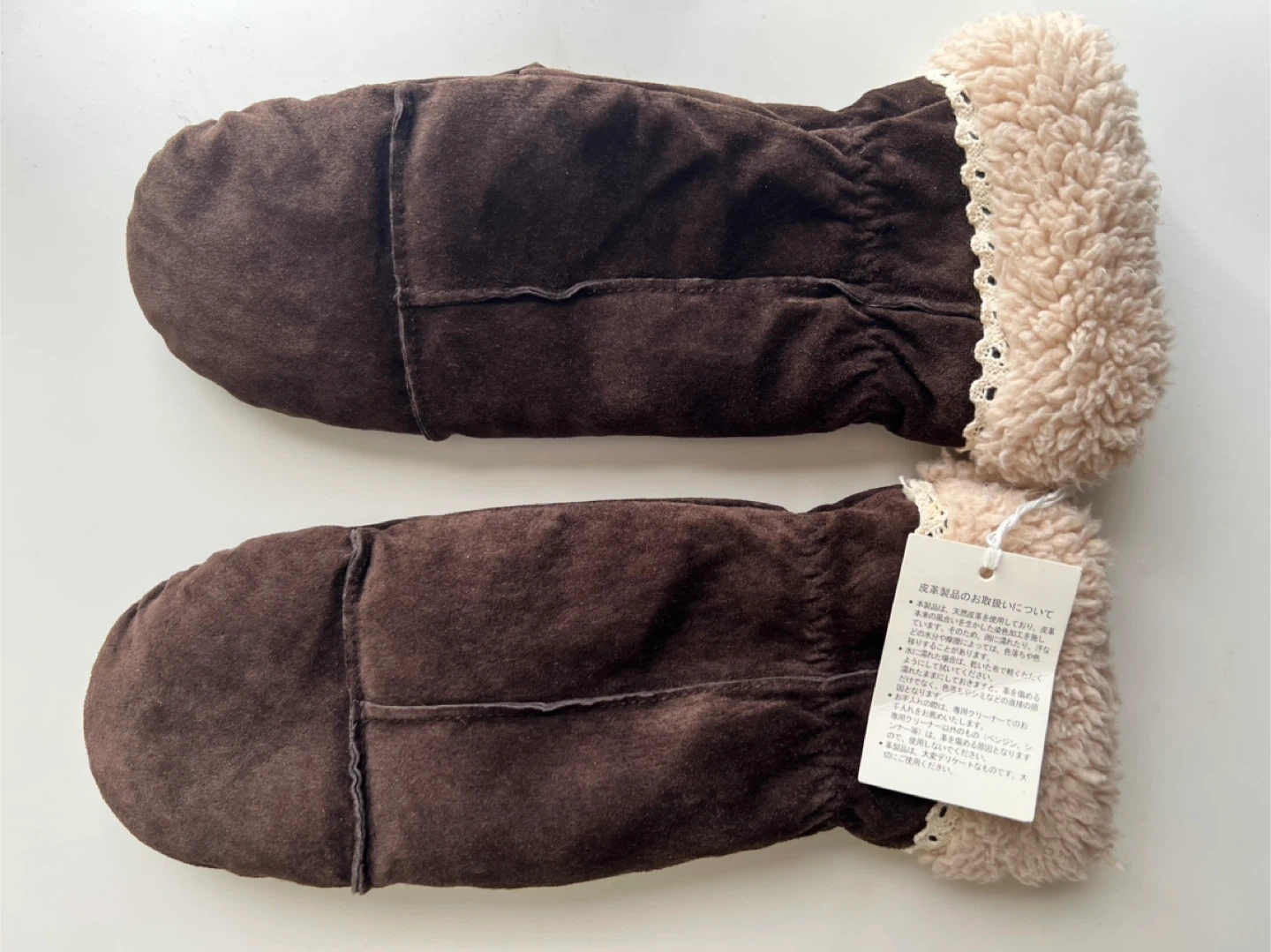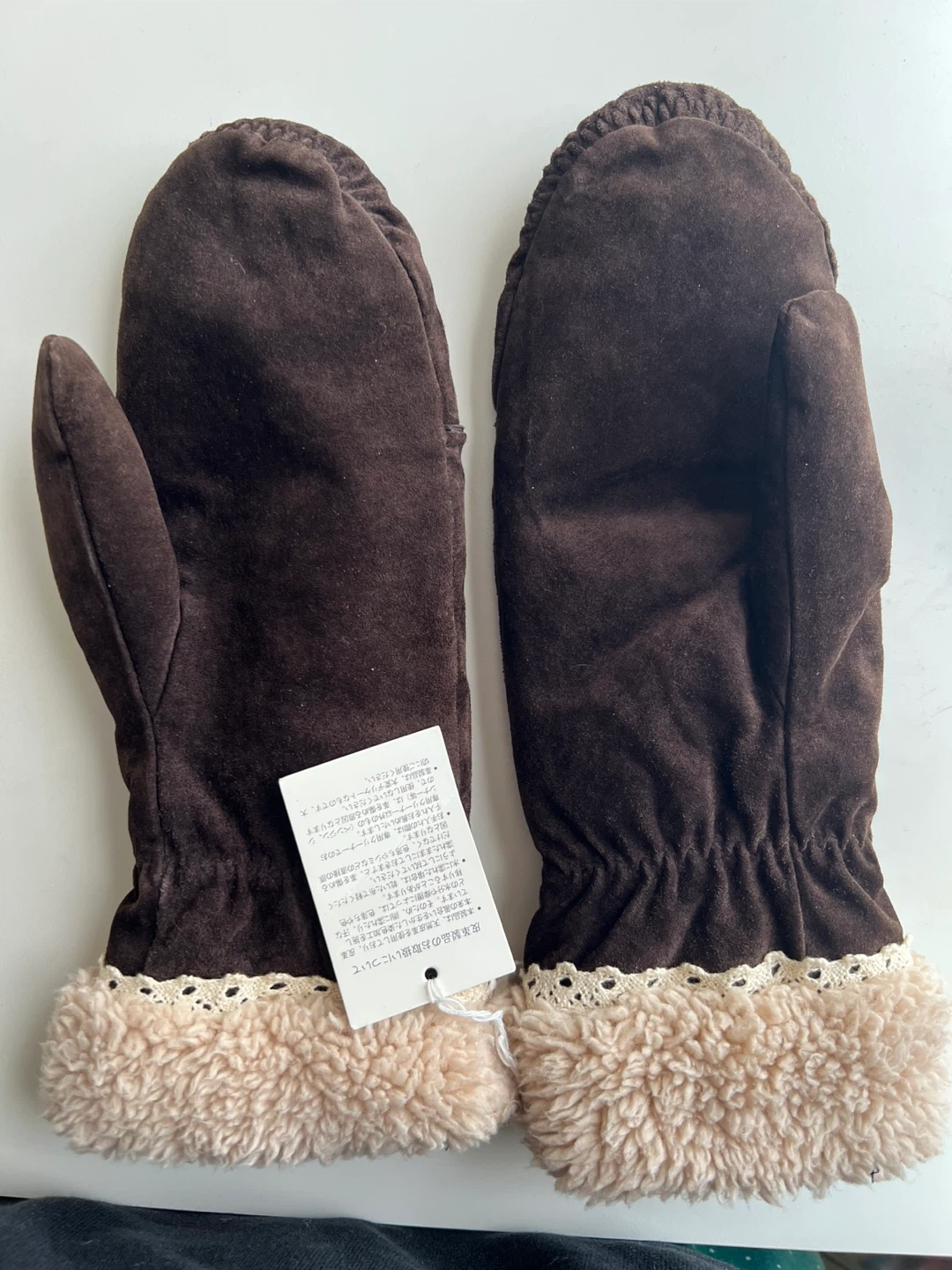 Cozy brown suede mittens with a soft sherpa lining and lace trim. Elasticized wrist for a snug fit. Keeps your hands warm in colder weather!