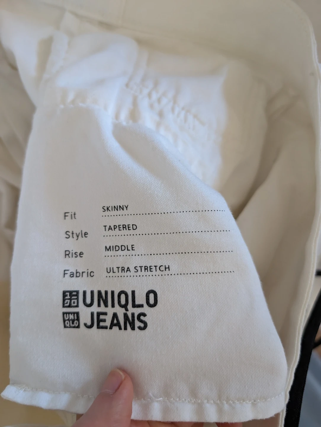 These are Uniqlo women's skinny jeans in a size medium. They're made from a blend of 97% cotton and 3% spandex for ultra stretch comfort. The fit is skinny with a tapered leg and middle rise.