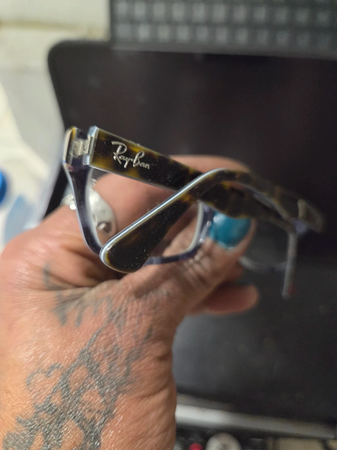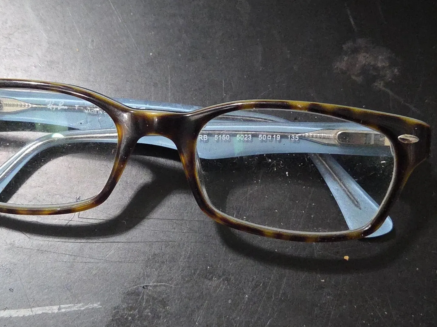 Ray-Ban eyeglasses. Model RB 5150 5023. Tortoiseshell frame with blue temples. Lens width 50mm, bridge 19mm, temple length 135mm.