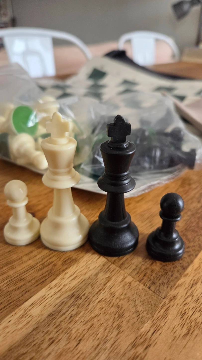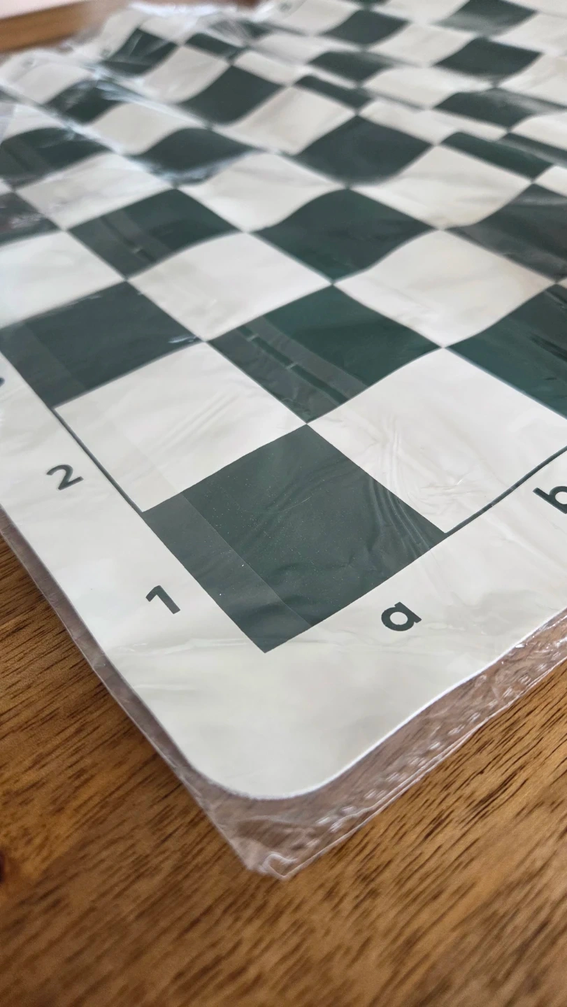This is a brand new portable chess set with a mat and plastic pieces. It includes a carrying bag for easy transport. The set comes with white and black pieces. It's great for playing chess on the go!
